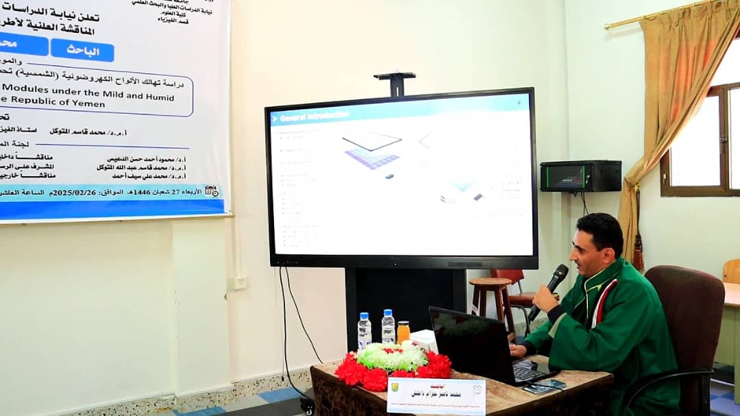 Researcher Mohammed Nasser Hazam Dahesh has been awarded a Doctorate degree in the Physics Department, specializing in (Solar Energy Physics), from the Faculty of (Science) at Sana’a University for his thesis titled: “Study of Photovoltaic (Solar) Panels Degradation under the Temperate and Humid Climatic Conditions of the Republic of Yemen”. The Viva defence took place on Wednesday, 27th of Sha’ban, 1446 AH, corresponding to February 26th, 2025 AD.