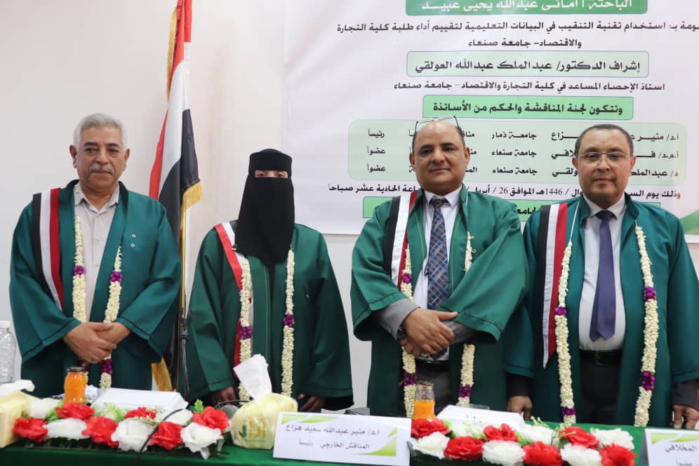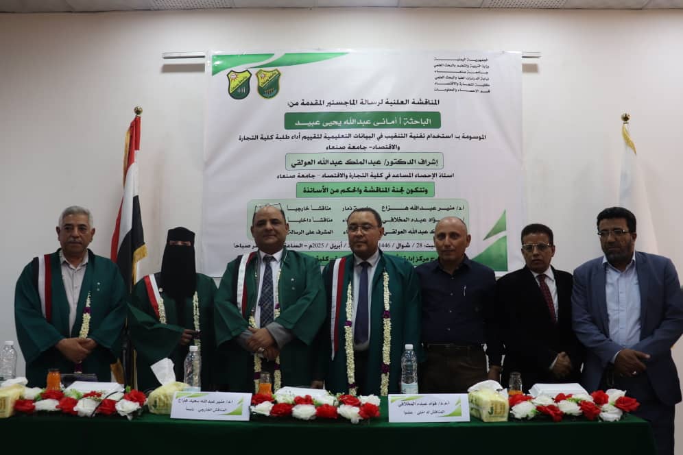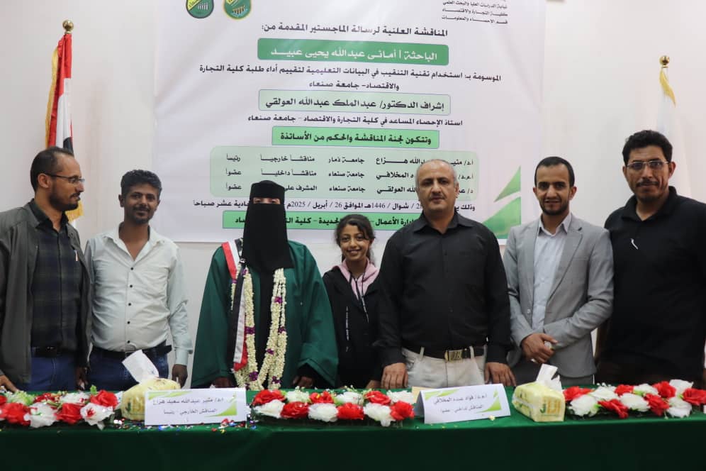 Researcher Amani Abdullah Yahya Obaid has been awarded a Master’s degree in Statistics and Information with an overall grade of (Excellent) at a percentage of (95%) from the Faculty of Commerce and Economics at Sana’a University for her thesis entitled “Using Data Mining Techniques in Educational Data to Evaluate the Performance of Students at the Faculty of Commerce and Economics, Sana’a University”.