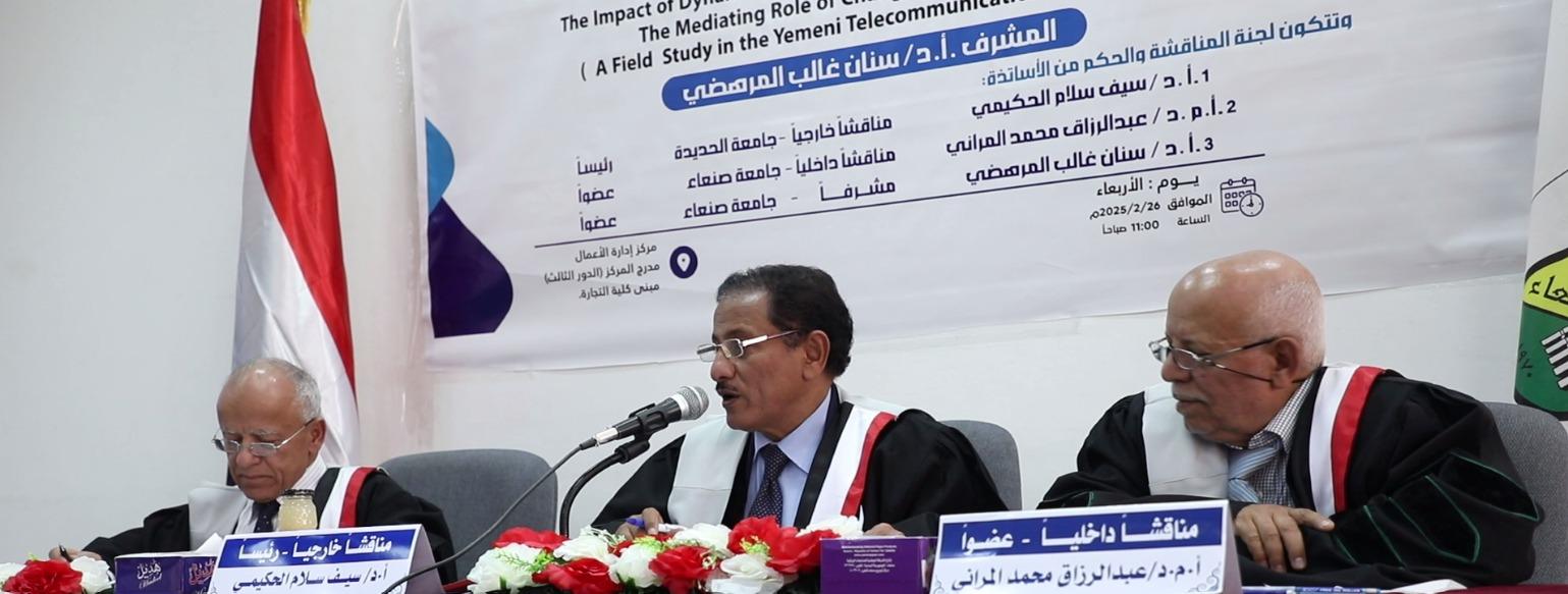 The Public Viva-Voce Examination for the PhD Dissertation hereto entitled, The Impact of Dynamic Capabilities on Digital Transformation and the Mediating Role of Change Management: A Field Study on the Yemeni Telecommunications Sector, submitted by Mr. Nizar Abdulwahab Ali Al-Moayed, to the Center of Business Administration, was held on Wednesday, 27/08/1446 Hijri, corresponding to 26/02/2025. The Viva-Voce Committee, which was formed based on a resolution issued by the Post-Graduate Studies and Scientific Research Council, consisted of the following: