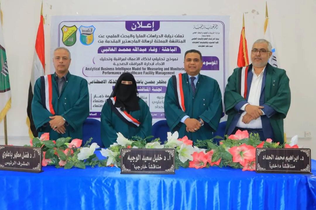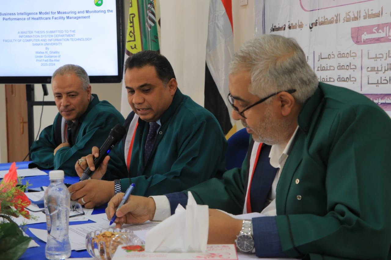 Ms. Wafaa Abdullah Mohammed Al-Ghalibi was awarded a Master’s degree with an average of (Excellent) and a grade of 98%, in the major of information system, for her thesis titled “An Analytical Model for Business Intelligence in Monitoring and Evaluating Performance for Healthcare Facility Management.”, which was submitted to Department of Information Systems, Faculty of Computer Sciences – Sana’a University. The defense was held on Wednesday, 27 Sha’ban 1446 Hijri, corresponding to February 26, 2025.