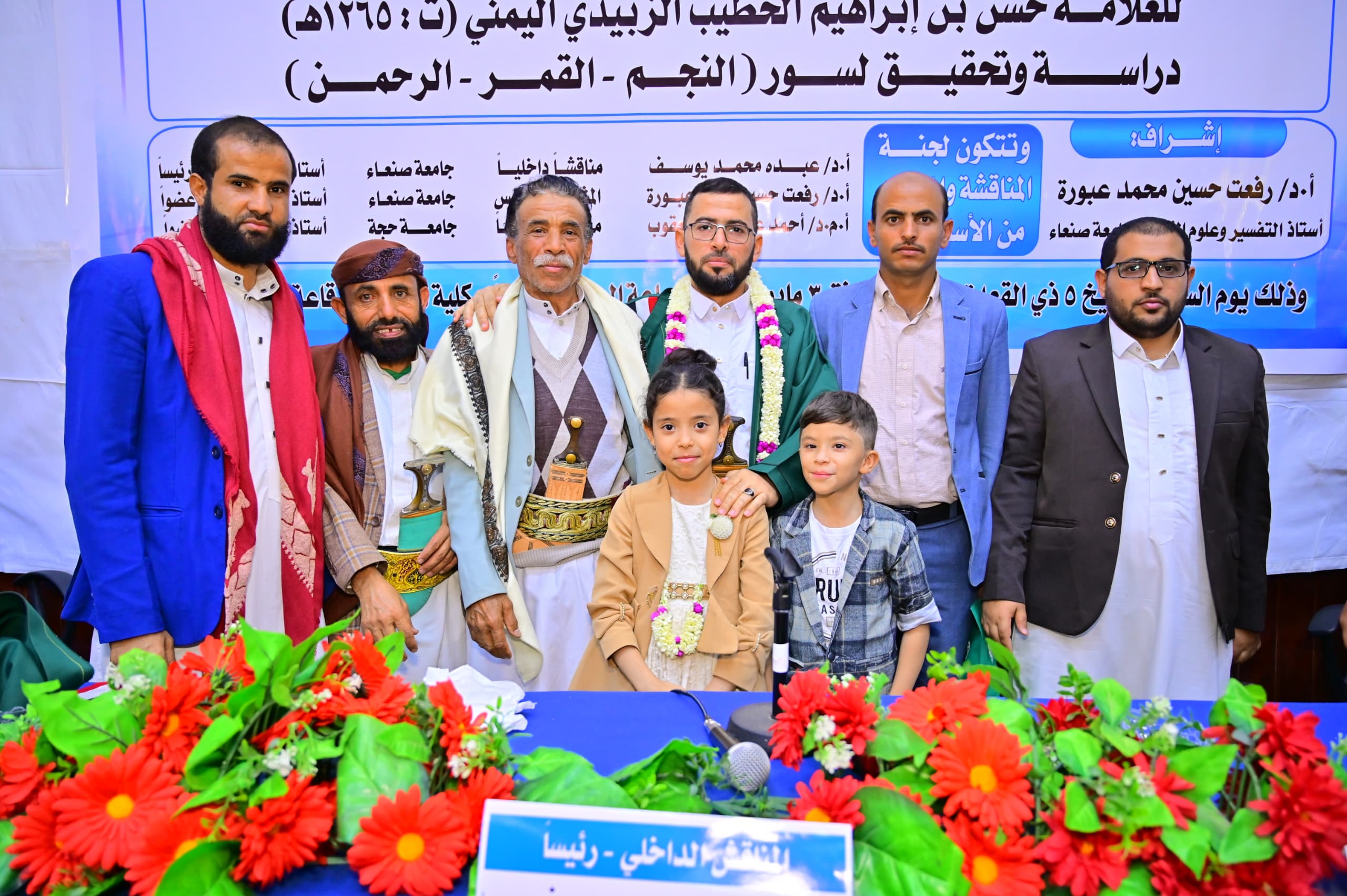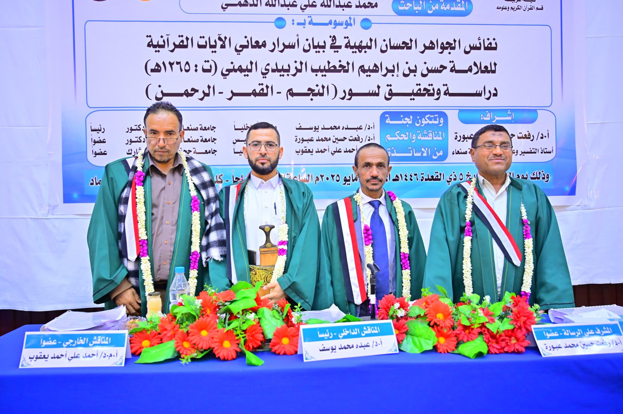 Researcher Mohammed Abdullah Ali Abdullah Aldohmi has earned his Master’s degree with an overall grade of excellent and a score of 95%, with a recommendation for publication and circulation among universities and research centers. His specialization is “Interpretation and Quranic studies” at the Faculty of Education, Sana’a University. His thesis “A Study and Verification of Surahs Annajm, Alqamar, and Arrahman as in the Tafsir book ‘Nafa’is Aljawaher Alhessan albahiyya fi Bayan Asrar Ma’ani ala’ayat alqura’aniyya’ by Scholar Hassan bin Ibrahim alkhatib, who passed away in 1265 AH.