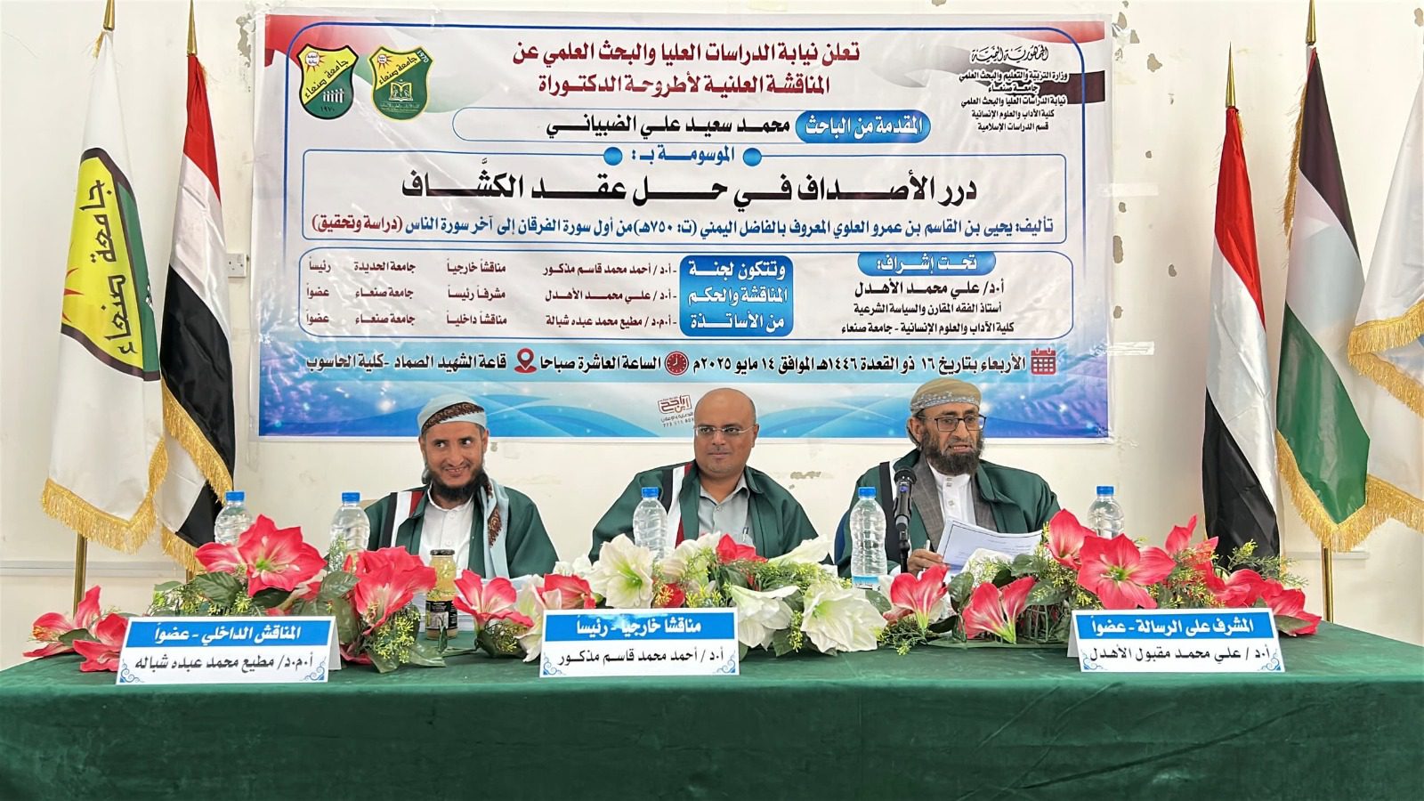 The Public Viva-Voce Examination for the PhD Dissertation hereto entitled, “Durar Al-Asdaf fi Hall ‘Uqad Al-Kashshaf”, by Yahya Bin Al-Qasim Bin ‘Amr Al-‘Alawi, Known as Al-Fadil Al-Yamani (d. 750 Hijri), from the Beginning of Surat Al-Furqan to the End of Surat Al-Nnas: A Study and Investigation, submitted by Mr. Mohammed Saeed Ali Al-Dhabyani, to the Department of Islamic Studies, majoring in Tafsir (Quranic exegesis), at the Faculty of Arts and Humanities, Sana’a University, was held on Wednesday, Dhu al-Qa’dah 16, 1446 Hijri, corresponding to May 14, 2025. The Viva-Voce Committee, which was formed based on a resolution issued by the Post-Graduate Studies and Scientific Research Council, consisted of the following: