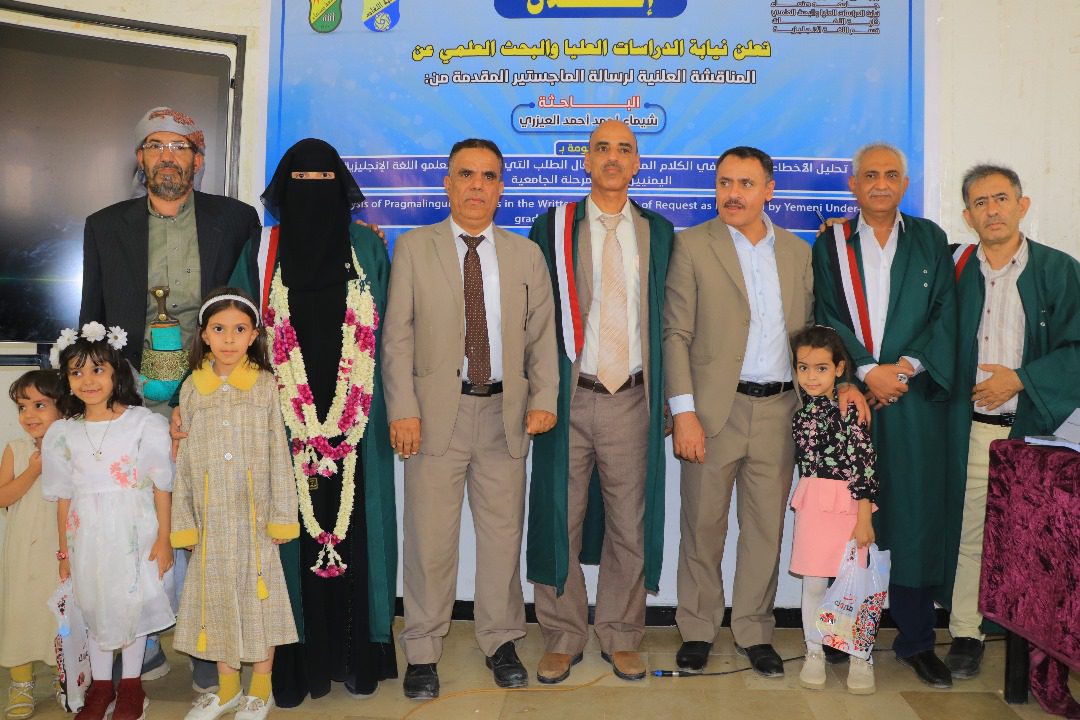 Researcher Shaimaa Ahmed Ahmed Alaizri has been awarded a Master’s degree with a grade of 90% (Excellent) from the English Department, Faculty of Languages at Sana’a University for her thesis entitled: “An Analysis of Pragmatic Errors in Written Speech Acts of Request Made by Yemeni University Students of English” The Viva defence took place on Wednesday, 16th of Dhu al-Qa’dah 1446 AH, corresponding to May 14, 2025 AD.