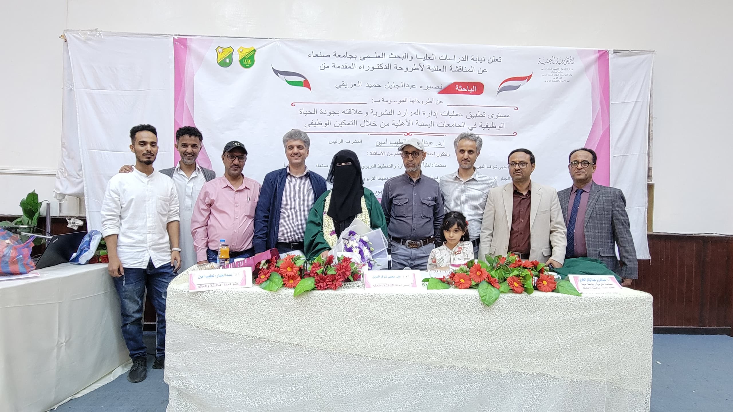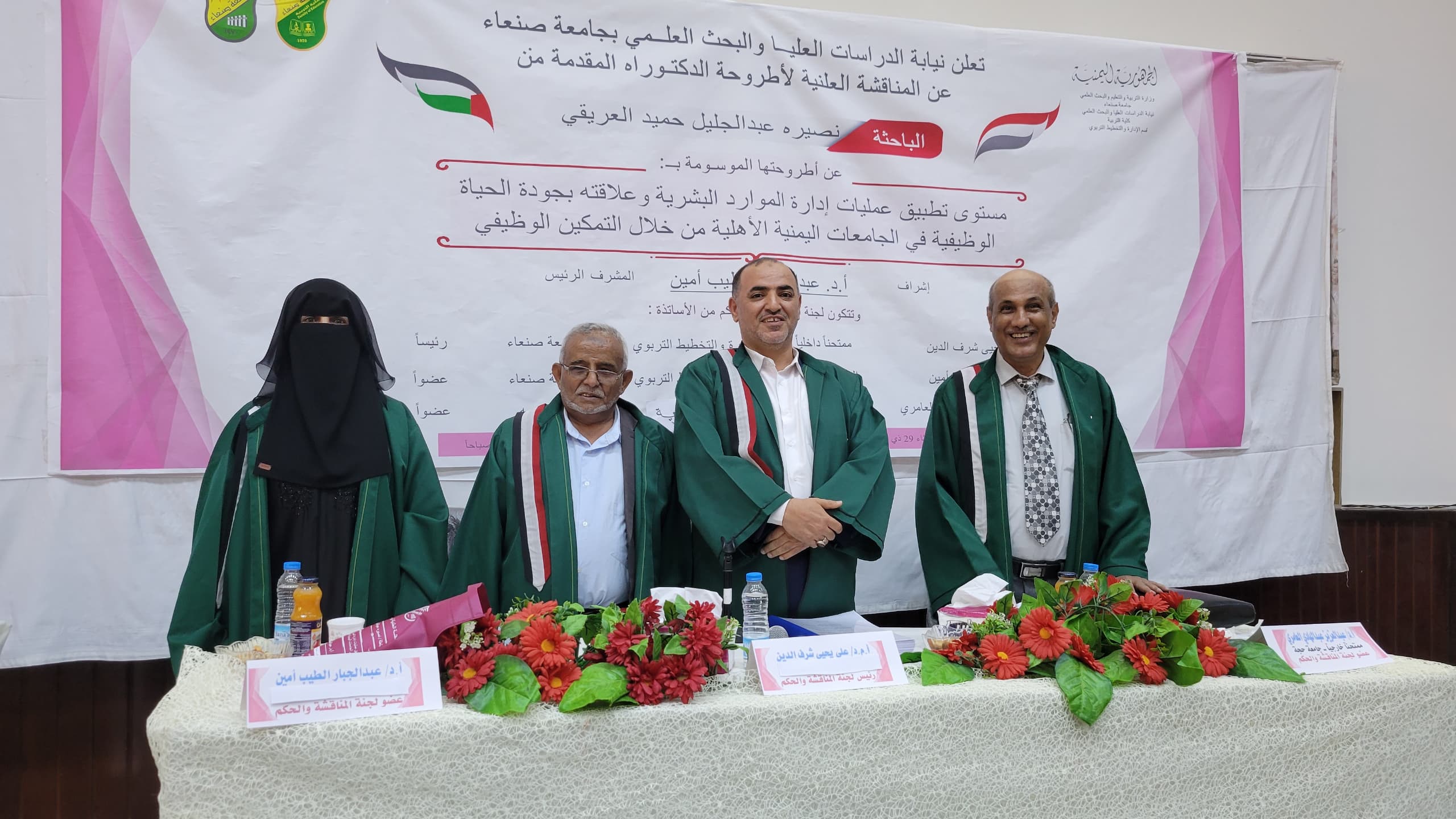 The Public Viva-Voce Examination for the PhD Dissertation hereto entitled, The Level of Application of Human Resources Management Processes and its Relationship to Quality of Work Life in Yemeni Private Universities through Job Empowerment, submitted by Ms. Nassirah Abduljalil Hamid Al-Areeqi, to the Department of Educational Administration and Planning at the Faculty of Education, Sana’a University, was held on Tuesday, Dhu al-Qa’dah 29, 1446 Hijri, corresponding to May 27, 2025. The Viva-Voce Committee, which was formed based on a resolution issued by the Post-Graduate Studies and Scientific Research Council, consisted of the following: