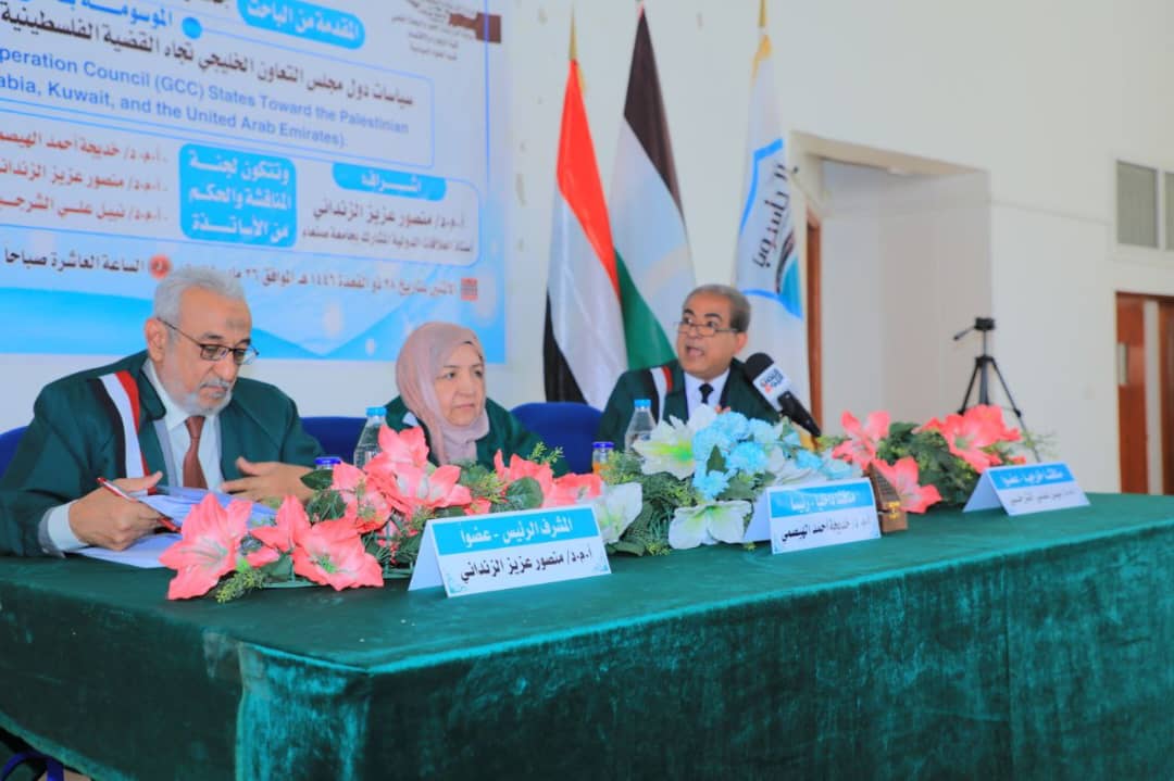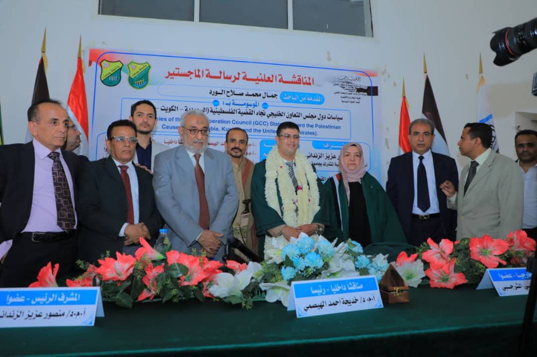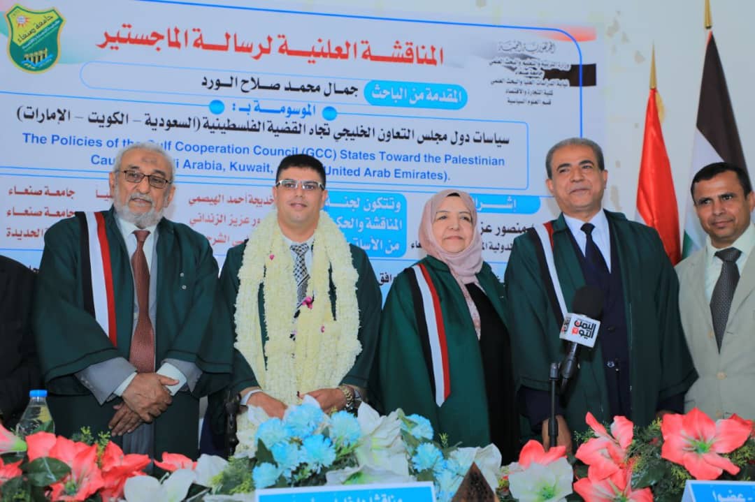 Mr. Jamal Mohammed Salah Al-Ward was awarded a Master’s degree, majoring in International Relations, with an average of (Excellent) and a grade of (92%) for his thesis titled “The Policies of the Gulf Cooperation Council (GCC) States Towards the Palestinian Cause (Saudi Arabia, Kuwait, UAE),” which was submitted to the Department of Political Science, Faculty of Commerce and Economics – Sana’a University. The MA defense was held on Dhu al-Qa’dah 28, 1446 Hijri, corresponding to May 26, 2025.