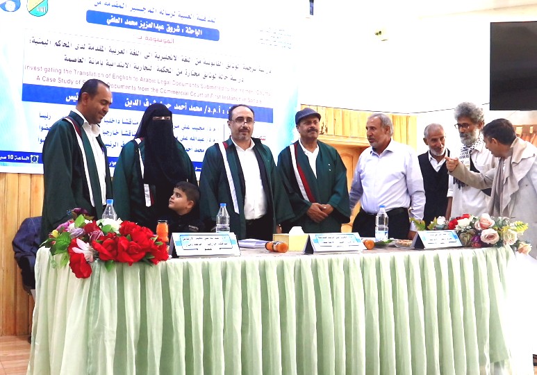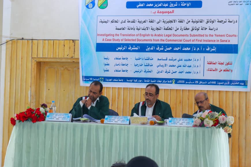 Ms. Shorouq Abdulaziz Mohammed Al-Olofy was awarded a Master’s degree with an average of (Excellent) for her thesis titled “Investigating the Translation of English to Arabic Legal Documents Submitted to the Yemeni Courts: A Case Study of Selected Documents from the Commercial Court of First Instance in Sana’a,” which was submitted to the Department of English, Faculty of Languages – Sana’a University. The MA defense was held on Thursday, Dhu al-Hijjah 29, 1446 Hijri, corresponding to May 29, 2025.