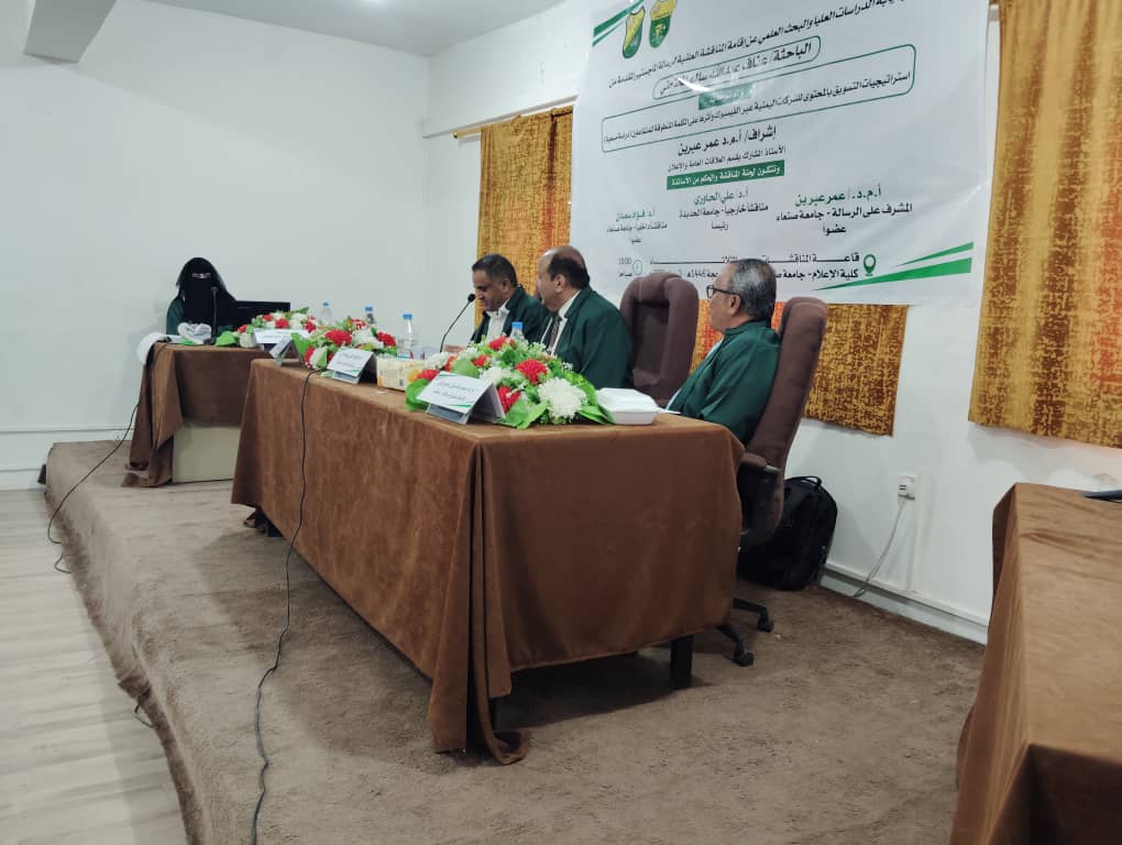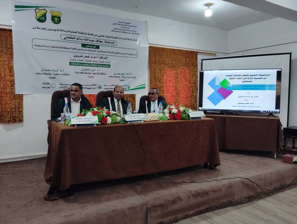 Al-Matheni’s thesis, titled “Content Marketing Strategies of Yemeni Companies on Facebook and Their Impact on Electronic Word-of-Mouth Among Interacting Users,” was submitted to the Department of Public Relations, Faculty of Mass Communication, Sana’a University. The defense took place on Tuesday, 07/12/1446 Hijri, corresponding to June 3, 2025.