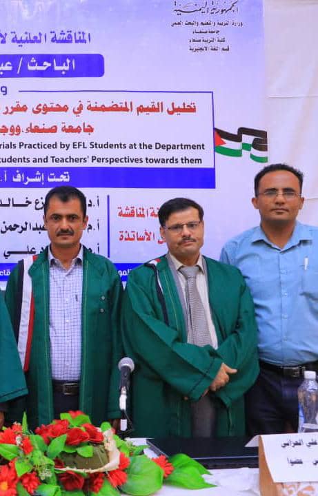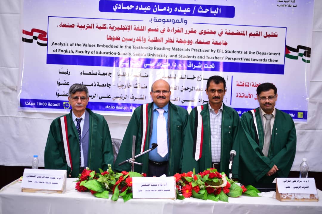 Mr. Abdo Radman Abdo Humadi was awarded a PhD degree for his dissertation titled “Analysis of the Values Embedded in the Textbooks Reading Materials by EFL Students at the Department of English, Faculty of Education – Sana’a, Sana’a University, and Students’ and Teachers’ Perspectives towards Them,” which was submitted to the Department of English, Faculty of Education – Sana’a University. The PhD dissertation defense was held on Monday, Dhu al-Hijjah 6, 1446 Hijri, corresponding to June 2, 2025.