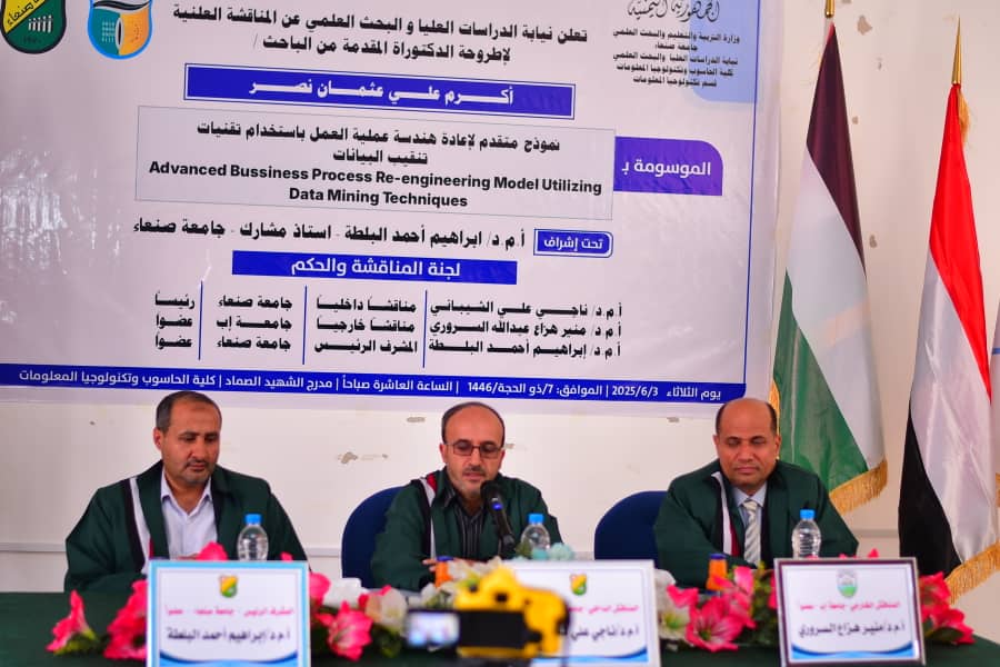Mr. Akram Ali Othman Nasr was awarded a PhD degree for his dissertation titled “Advanced Business Process Re-Engineering Model Utilizing Data Mining Techniques,” which was submitted to the Department of Information Technology, Faculty of Computer and Information Technology – Sana’a University. The PhD dissertation defense was held on Tuesday, Dhul-Hijjah 7, 1446 Hijri, corresponding to June 3, 2025.