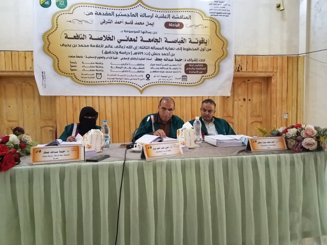 Ms. Eman Mohammed Qasim Ahmed Al-Sharafi was awarded a Master’s degree in the major of Islamic Creed and Thought with an average of (Excellent) and a grade of (93%) for her thesis titled “Yaqutat Al-Ghuyasa Al-Jami’a Li Ma’ani Al-Khulasa Al-Nafi’a, by the Scholar Mohammed bin Yahya bin Ahmed Hanash (d. 719 Hijri) from the Beginning of the Manuscript to the End of the Third Issue: ‘Indeed, Allah Almighty is All-Knowing’: A Study and Investigation,” which was submitted to the Department of Islamic Studies, Faculty of Arts and Humanities – Sana’a University. The MA defense was held on Saturday, May 31, 2025.