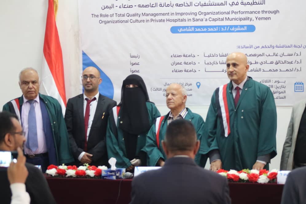 Ms. Samah Mutleq Ali Al-Soufi was awarded a PhD degree in Business Administration for her dissertation titled: The Role of Total Quality Management in Improving Organizational Performance through Organizational Culture in Private Hospitals in the Capital Secretariat – Sana’a, Yemen, which was submitted to the Center for Business Administration at Sana’a University. The dissertation defense was held on Tuesday, June 24, 2025.