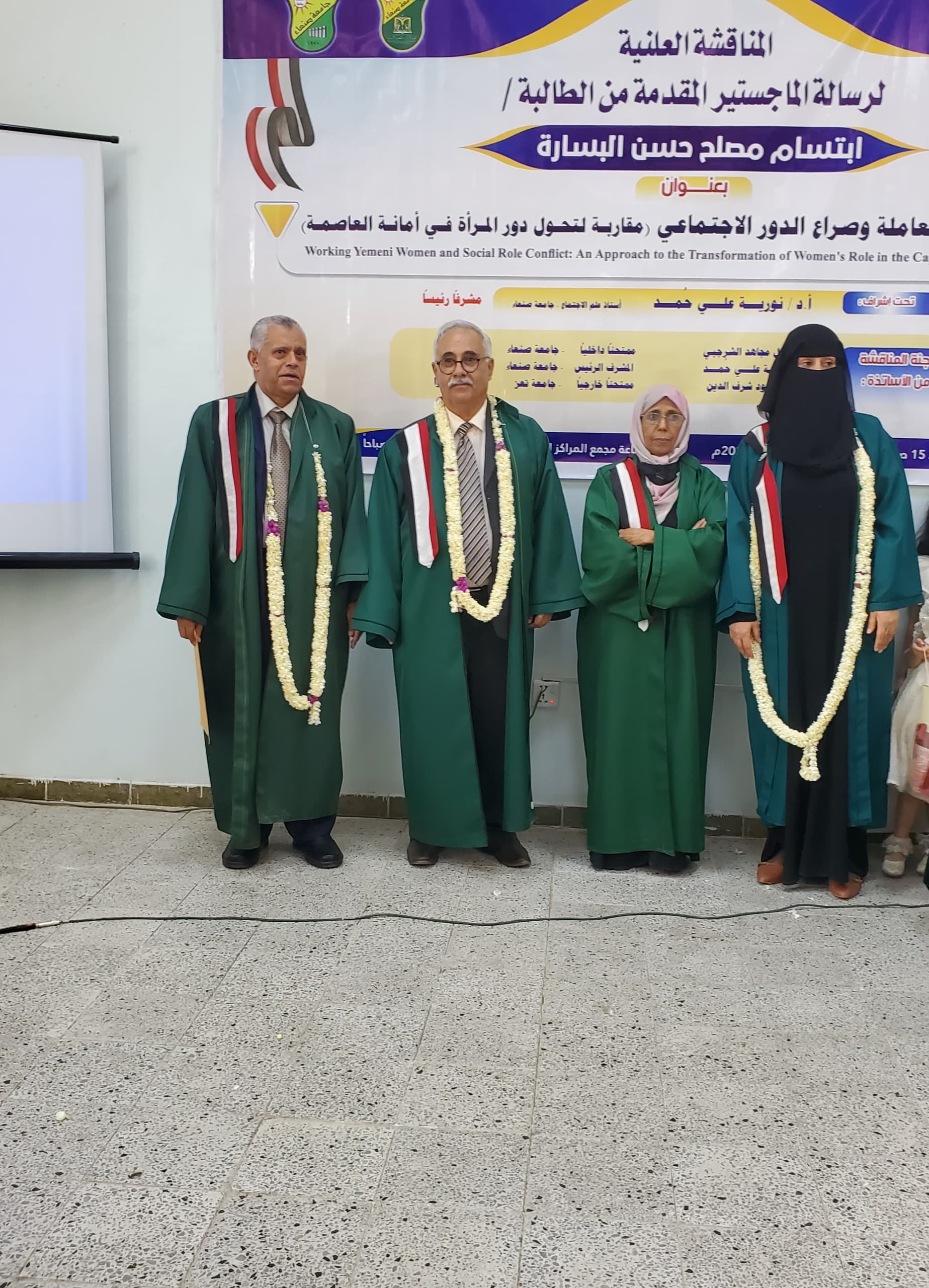 Ms. Ibtisam Musleh Hasan Hussein Al-Basarah was awarded a Master’s degree in sociology with a grade of (Excellent) and an average of (92%) for her thesis titled “Yemeni Working Woman and the Conflict of Social Roles: An Approach to the Transformation of Women’s Roles in the Capital Secretariat (Sana’a)“, which was submitted to Department of Sociology, Faculty of Arts and Humanities – Sana’a University. The defense was held on Sunday, August 10, 2025.