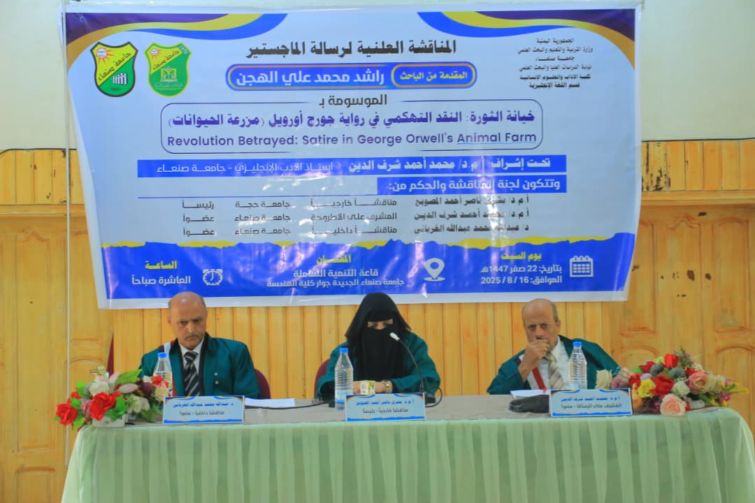 Mr. Rashid Mohammed Ali Al-Hajin was awarded a Master’s degree in in English Language and Literature with an average of (Excellent) and a grade of (94%) for his thesis titled: Revolution Betrayed: Satire in George Orwell’s Animal Farm, which was submitted to the Department of English, Faculty of Arts and Humanities – Sana’a University. The MA defense was held on Saturday, August 16, 2025.