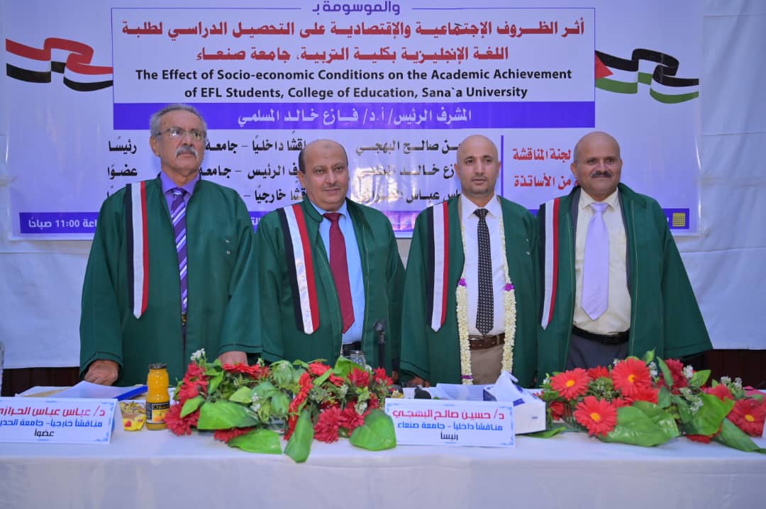 Mr. Adel Saleh Mohammed Saleh Ghaithan was awarded a Master’s degree in Curricula and Methods of Teaching English with an average of (Excellent) and a grade of (95%) for his thesis titled: The Impact of Social and Economic Conditions on the Academic Achievement of English Language Students at the Faculty of Education – Sana’a University, which was submitted to the Faculty of Education – Sana’a University. The MA defense was held on Wednesday, August 20, 2025.