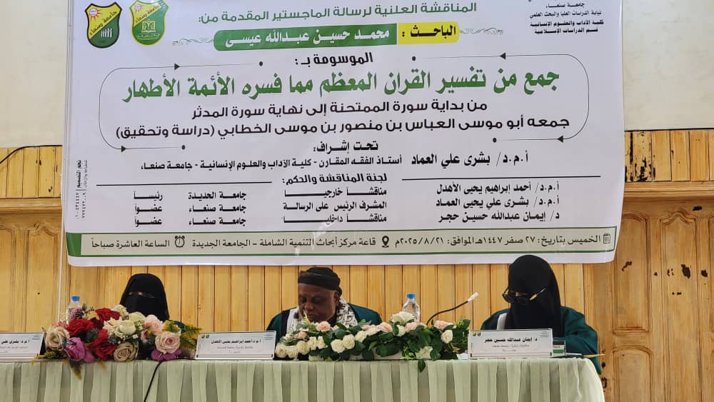 Mr. Mohammed Hussein Abdullah Issa was awarded a Master’s degree with a grade of Excellent, for his thesis titled “A Compilation of the Holy Quran’s Exegesis as Interpreted by the Pure Imams – From the Beginning of Surah Al-Mumtahanah to the End of Surah Al-Muddaththir – Compiled by Abu Musa Al-Abbas bin Mansour bin Musa Al-Khattabi: A Study and Investigation,” which was submitted to the Department of Islamic Studies, Faculty of Arts and Humanities – Sana’a University. The MA defense was held on Thursday, August 21, 2025, corresponding to Safar 27, 1447 Hijri.