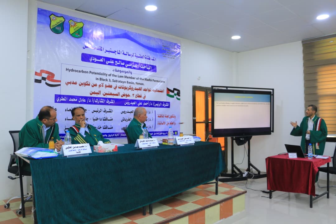 Mr. Azmi Saleh Ali Muthanna Al-Awdi was awarded a Master’s degree in Geology with distinction (Excellent) for his thesis titled: Hydrocarbon Potentiality of the Lam Member of the Madbi Formation in Block 3, Sab’atayn Basin, Yemen, which was submitted to the Faculty of Petroleum and Natural Resources – Sana’a University. The MA defense was held on Monday, September 1, 2025.