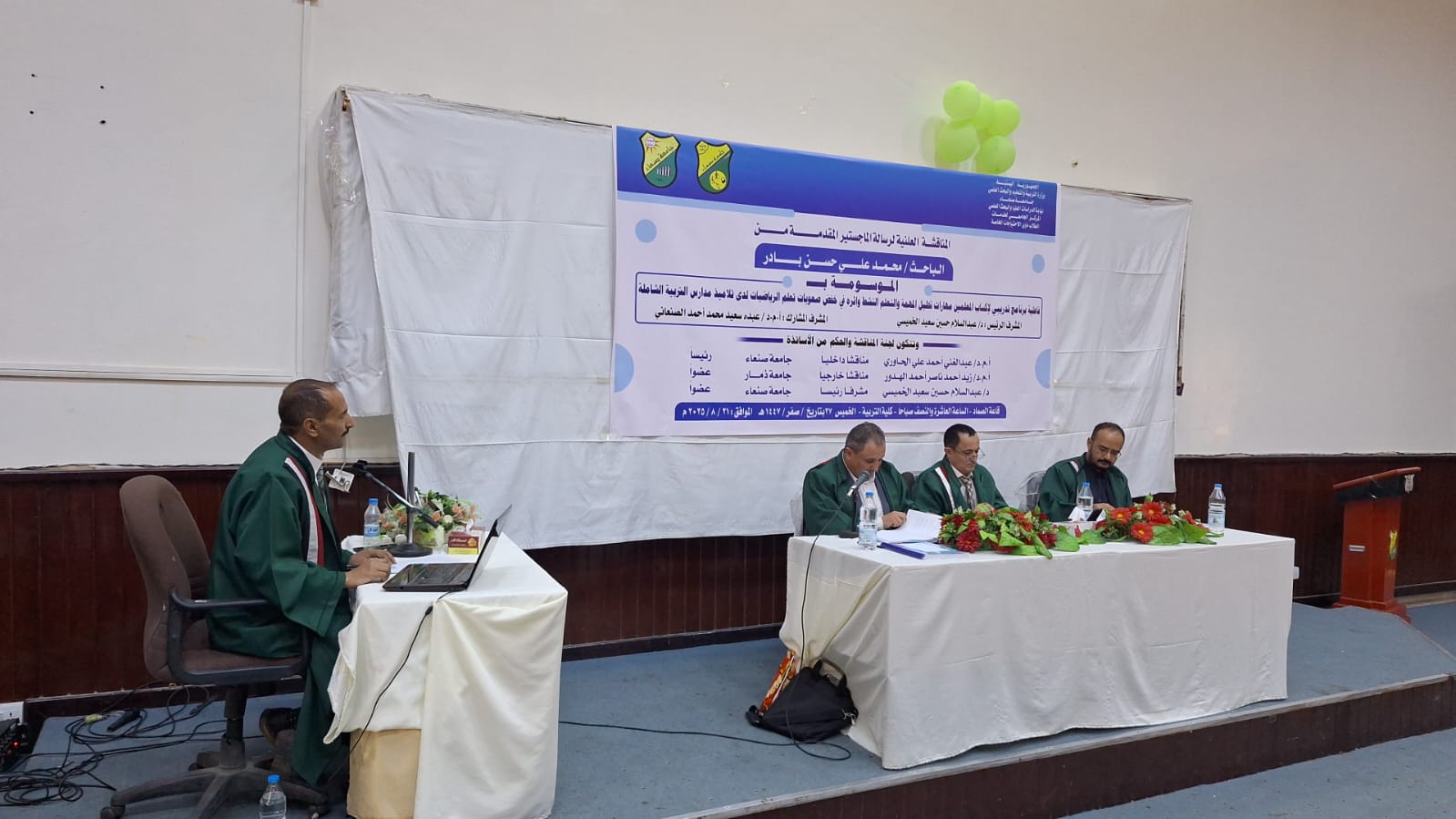 Mr. Mohammed Ali Hassan Bader was awarded a Master’s degree in special education (Learning Disabilities) with an average of (Excellent) and a grade of (95%) for his thesis titled “The Effectiveness of a Training Program to Equip Teachers with Task Analysis and Active Learning Skills and Its Impact on Reducing Math Learning Disabilities among Students in Inclusive Education Schools,” which was submitted to the University Service Center for Students with Special Needs (USCSSN) – Sana’a University. The MA defense was held on Thursday, August 21, 2025, corresponding to Safar 27, 1447Hijri.