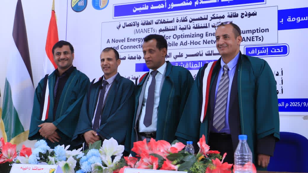 Mr. Abdulsalam Mansour Ahmed was awarded a PhD degree in Computing and Information Science with distinction for his dissertation titled: A Novel Model for Optimizing Energy Efficiency and Enhancing Connectivity in Mobile Ad Hoc Networks (MANETs), which was submitted to the Department of Information Technology, Faculty of Computer and Information Technology – Sana’a University. The dissertation defense was held on Wednesday, September 3, 2025.