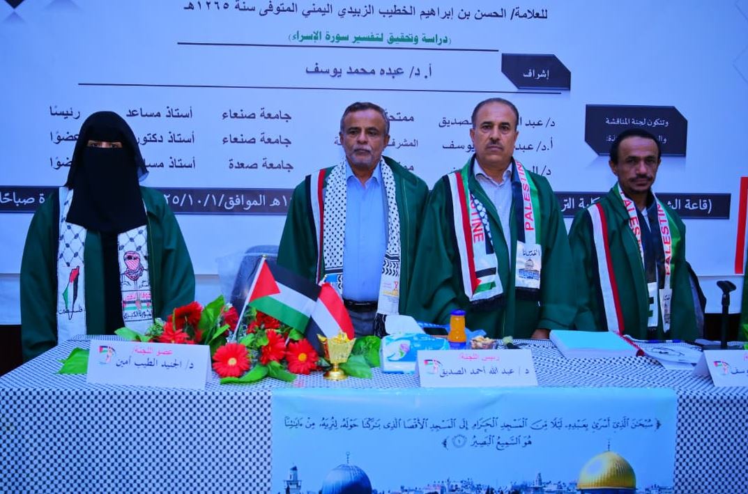 Ms. Budoor Ali Saleh Al-Aizari was awarded a Master’s degree with an average of (Excellent) and a grade of (95%) for her thesis titled “A Study and Investigation of Surat Al-Isra’ Tafseer from Nafais Al-Jawaher Al-Hissan Al-Bahiyyah fi Bayan Asrar Ma’ani Al-Ayat Al-Qur’aniyyah by the Scholar/ Al-Hasan bin Ibrahim Al-Khateeb Al-Zabeedi Al-Yamani (d. 1265 Hijri),” which was submitted to Faculty of Education – Sana’a University. The defense was held on Wednesday, October 1, 2025, corresponding to Rabi’ al-Akhir 9, 1447 Hijri.