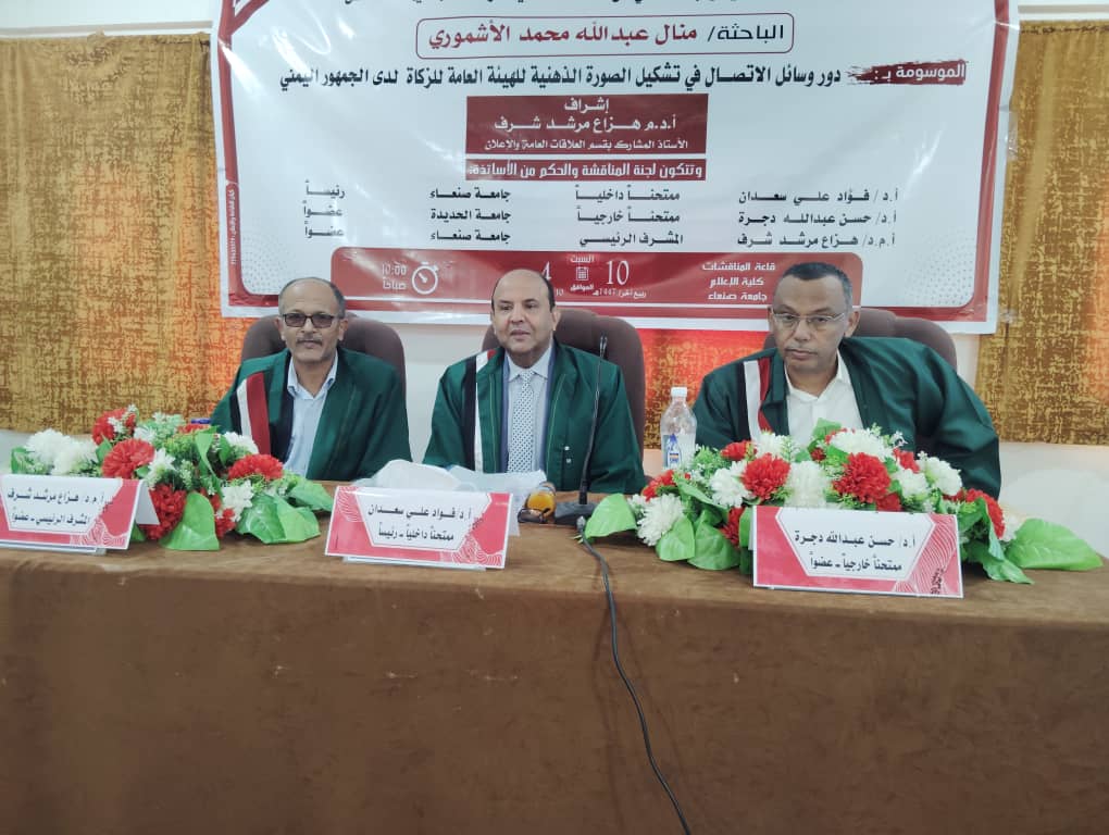 Ms. Manal Abdullah Mohammed Al-Ashmouri was awarded a Master’s degree with an average of (Excellent) and a grade of (95%) for her thesis titled “The Role of Communication Media in Shaping the Public Perception of General Authority of Zakat in Yemen,” which was submitted to Department of Radio and Television, Faculty of Mass Communication – Sana’a University. The defense was held on Saturday, October 4, 2025, corresponding to Rabi’ al-Akhir 10, 1447 Hijri.