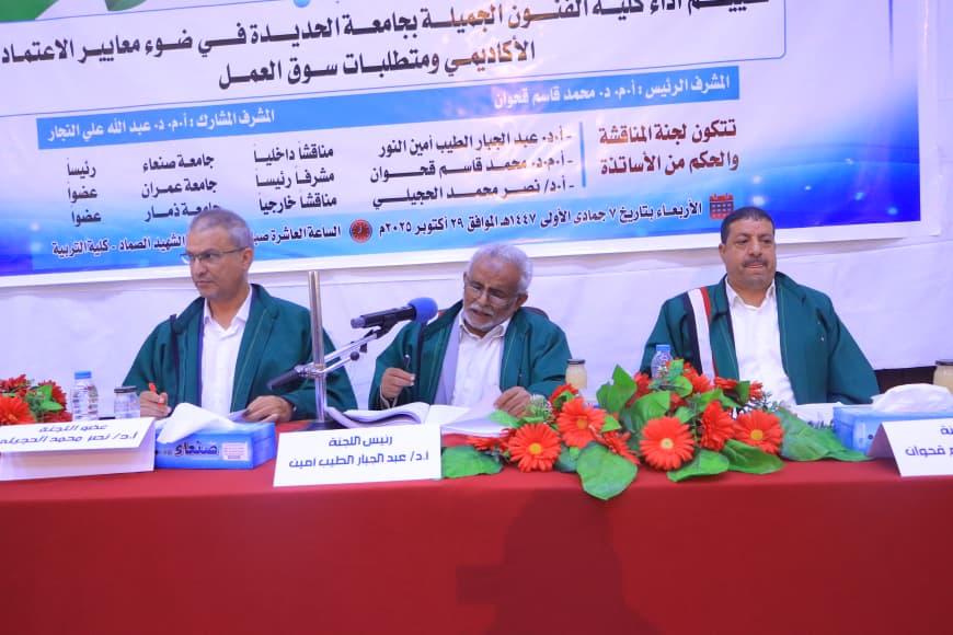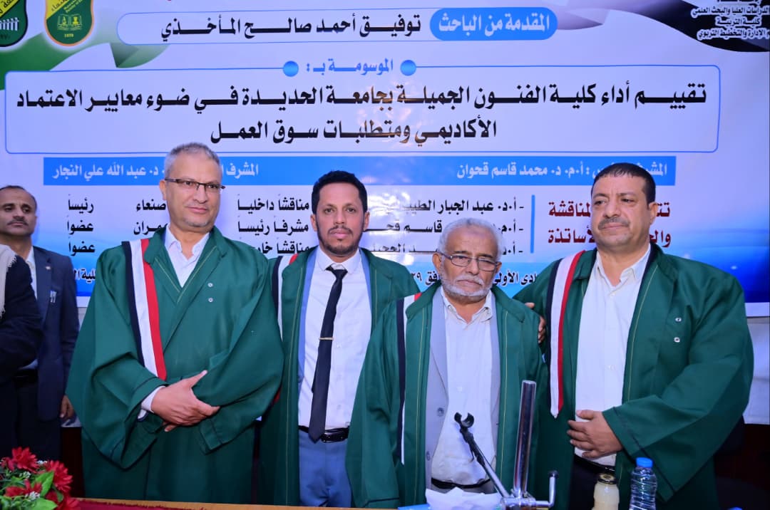 Mr. Tawfiq Ahmed Saleh Al-Makhdhi was awarded a PhD degree in Educational Administration and Planning for his dissertation titled: Evaluating Performance of Faculty of Fine Arts at Hodeidah University in Light of Academic Accreditation Standards and Labor Market Requirements, which was submitted to the Department of Educational Administration and Planning, Faculty of Education – Sana’a University. The dissertation defense was held on Wednesday, October 29, 2025.