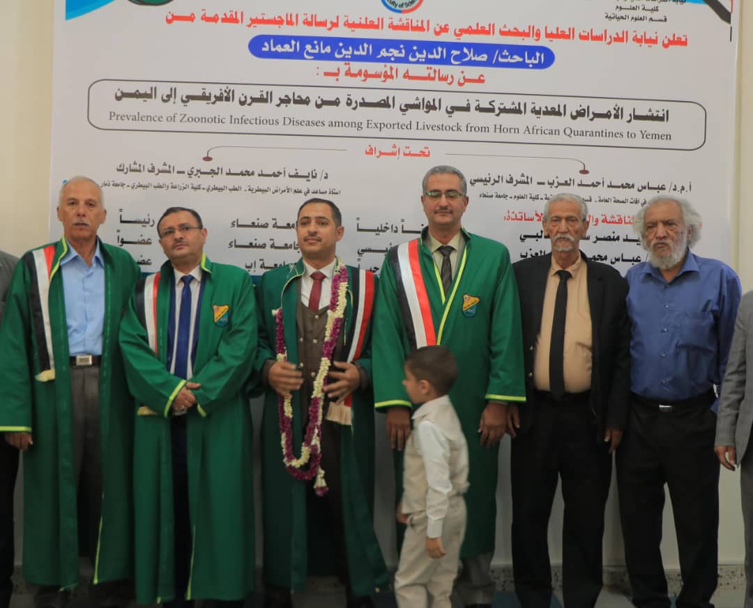 Mr. Salah Al-Deen Nagm Al-Deen Mani’ Al-Emad was awarded a Master’s degree in the major of zoology with an average of (Excellent) and a grade of (94%) for his thesis titled “The Prevalence of Zoonotic and Infectious Diseases in Livestock Exported from the Horn of Africa Quarantine Stations to Yemen,” which was submitted to Department of Biological Sciences, Faculty of Science – Sana’a University. The defense was held on Saturday, October 4, 2025, corresponding to Safar 25, 1447 Hijri.