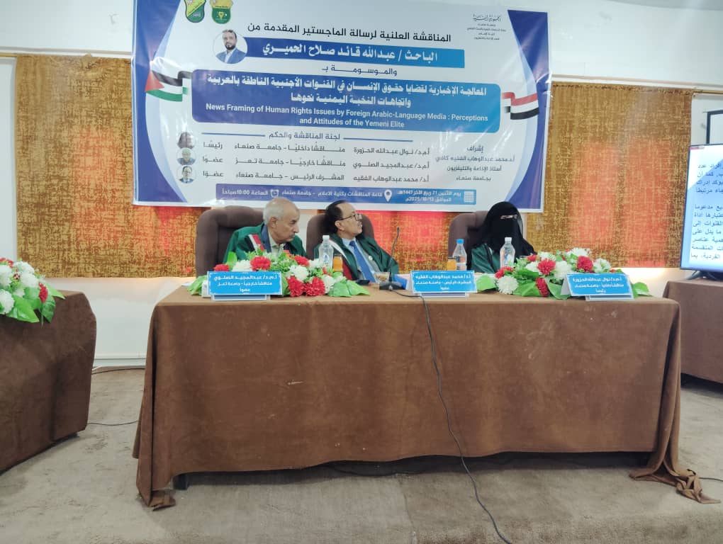 Mr. Abdullah Qa’ed Salah Al-Hemyari was awarded a Master’s degree in the major of Radio and Television with a grade of (Excellent) and an average of (95%) for his thesis titled “The News Framing of Human Rights Issues on Foreign Arabic-Speaking Channels and the Attitudes of the Yemeni Elite Towards Such Channels,” which was submitted to Department of Radio and Television, Faculty of Mass Communication – Sana’a University. The defense was held on Monday, October 13, 2025.
