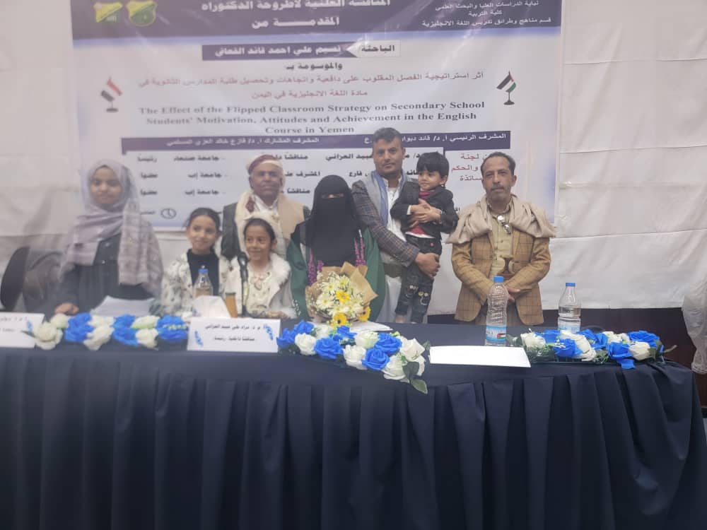 Ms. Naseem Ali Ahmed Qaed Al-Quaafi was awarded a PhD degree in English Language Curriculum and Teaching Methods for her dissertation titled: The Effect of the Flipped Classroom Strategy on Secondary School Students’ Motivation, Attitudes, and Achievement in the English Course in Yemen, which was submitted to Faculty of Education – Sana’a University. The dissertation defense was held on Thursday, October 30, 2025.