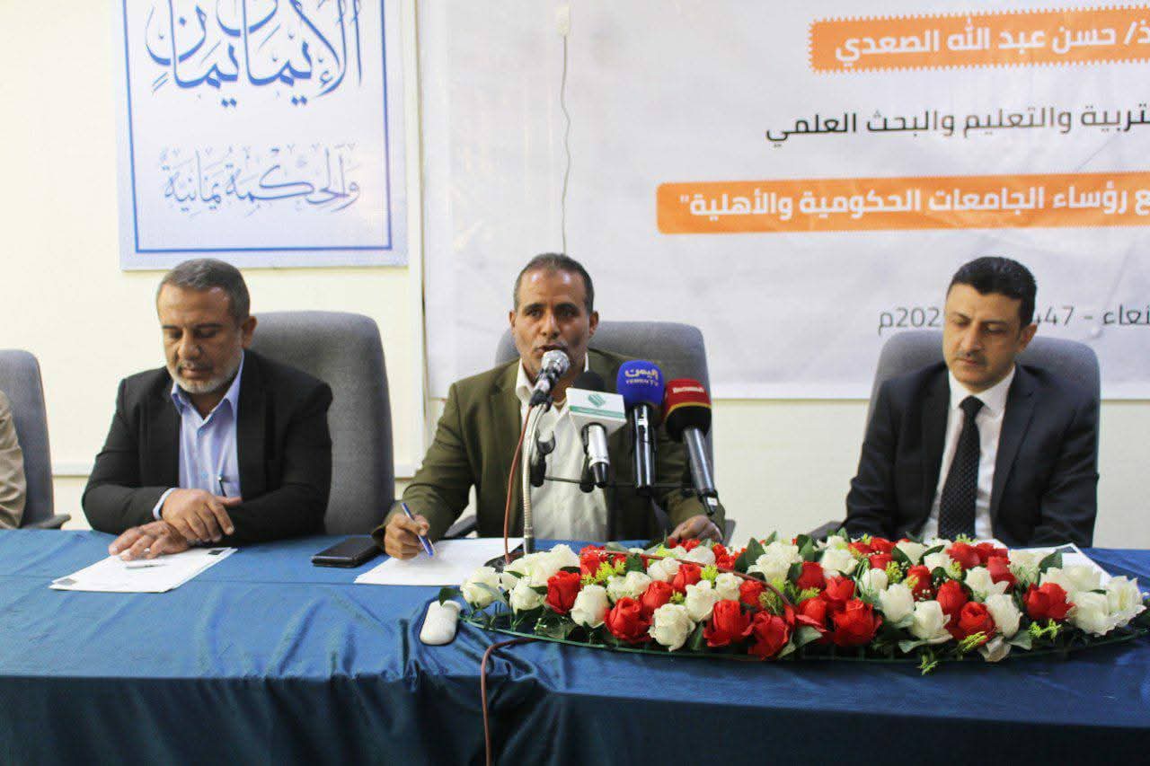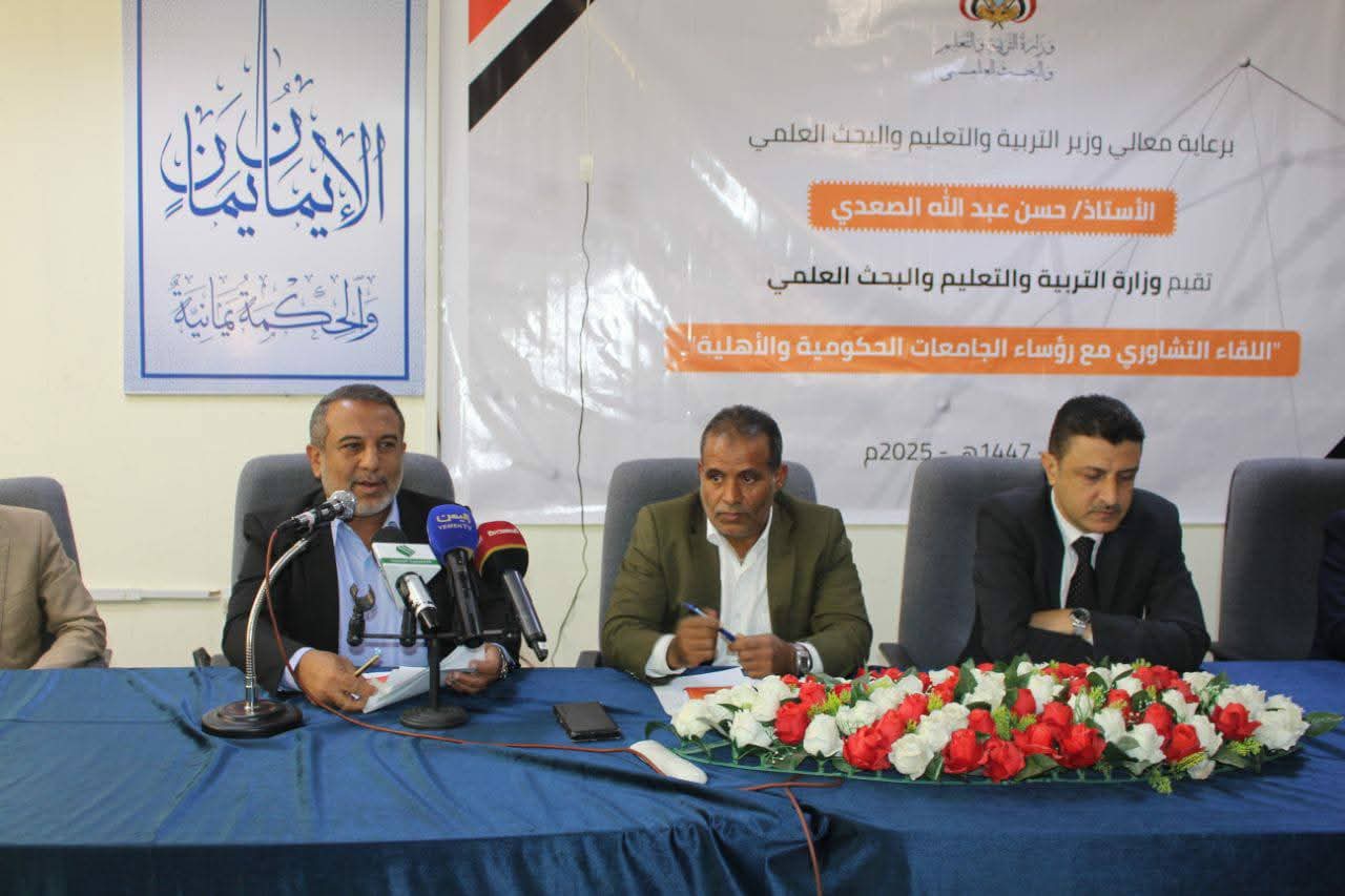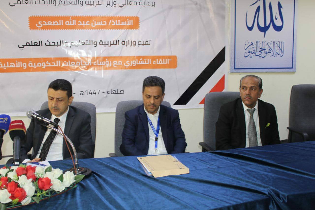Prof. Mohammed Ahmed Al-Bukhaiti, Rector of Sana’a University, participated today in the consultative meeting for presidents of public and private universities. The meeting was organized by the Higher Education Sector at the Ministry of Education and Scientific Research in Sana’a to discuss application and admission mechanisms, the progress of the educational, academic, and research process in universities, and to address current challenges and issues.