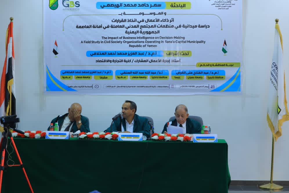 Ms. Samar Hamed Mohammed Ahmed Al-Haisami was awarded a Master’s degree in Business Administration for her thesis titled: The Impact of Business Intelligence on Decision-Making: A Field Study on Civil Society Organizations Operating in the Capital Secretariat – Sana’a, Republic of Yemen, which was submitted to the Faculty of Commerce and Economics– Sana’a University. The MA defense was held on Thursday, October 30, 2025.