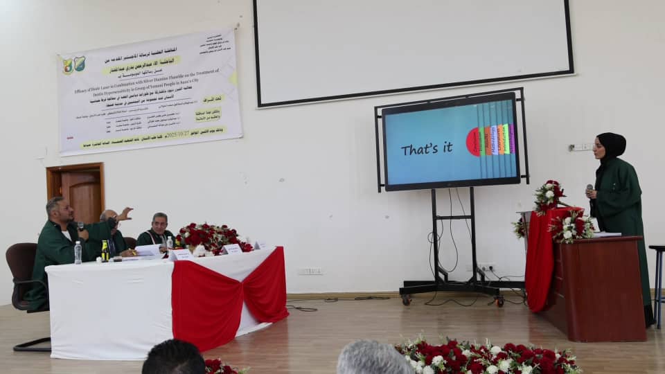 Ms. Alaa Abdulrahman Badri Abdulmukhtar was awarded a Master’s degree in Restorative and Aesthetic Dentistry–Clinical Restorative Dentistry for her thesis titled: Effectiveness of Laser in Combination with Silver Diamine Fluoride in the Management of Tooth Hypersensitivity among a Group of Yemenis in Sana’a City, which was submitted to the Faculty of Dentistry – Sana’a University. The MA defense was held on Monday, October 27, 2025.