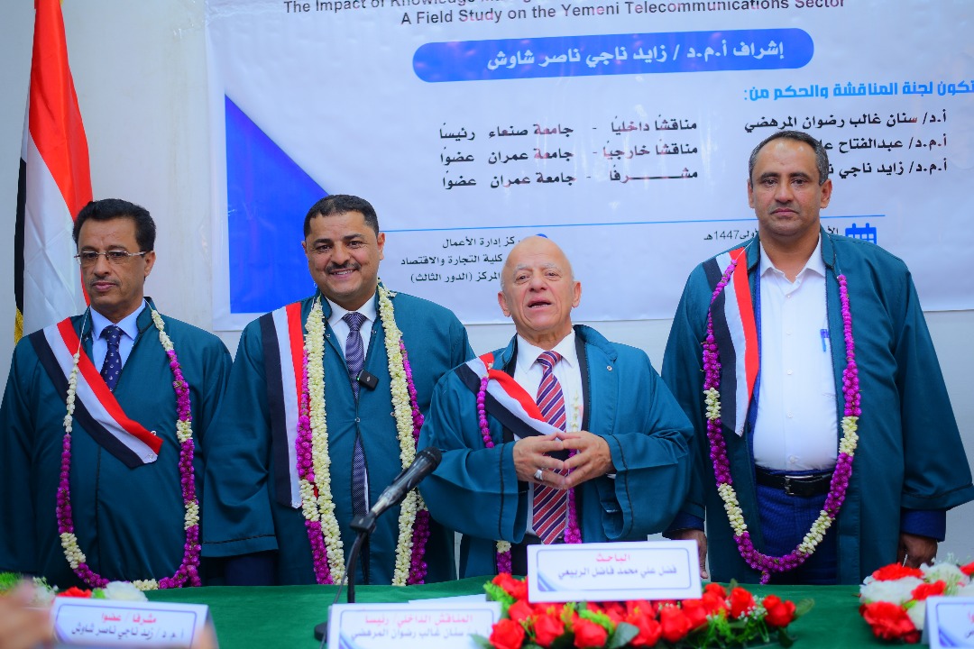 Mr. Fadhl Ali Mohammed Fadhl Al-Rabaie was awarded a PhD degree in Business Administration for his dissertation titled: The Impact of Knowledge Management on Organizational Performance through Intellectual Capital: A Field Study on Yemeni Telecommunications Sector, which was submitted to the Center of Business Administration – Sana’a University. The dissertation defense was held on Sunday, November 9, 2025.