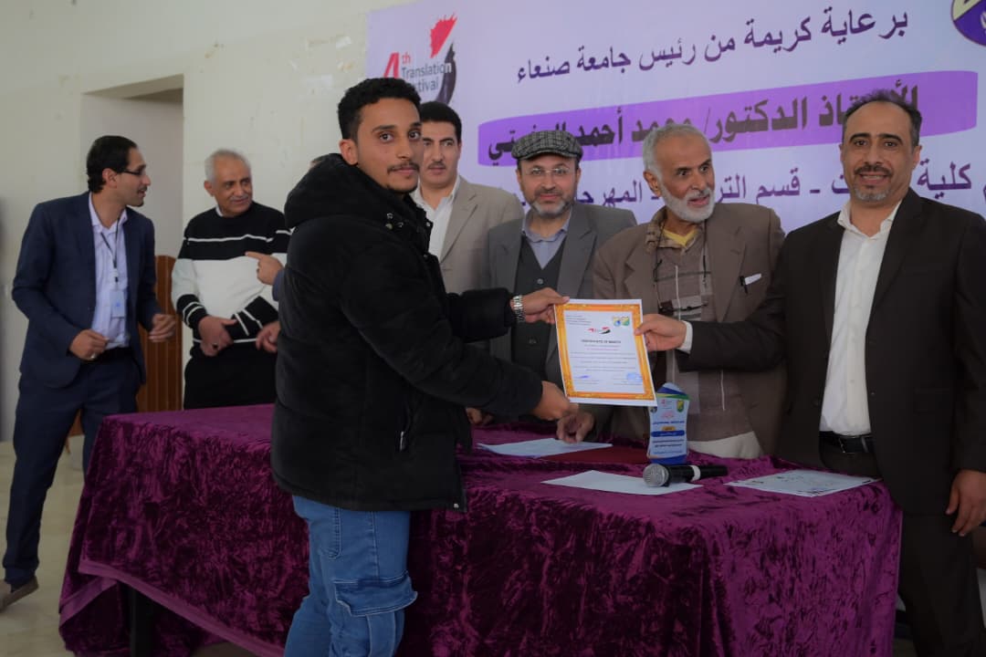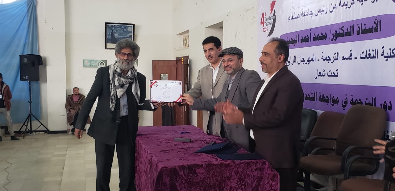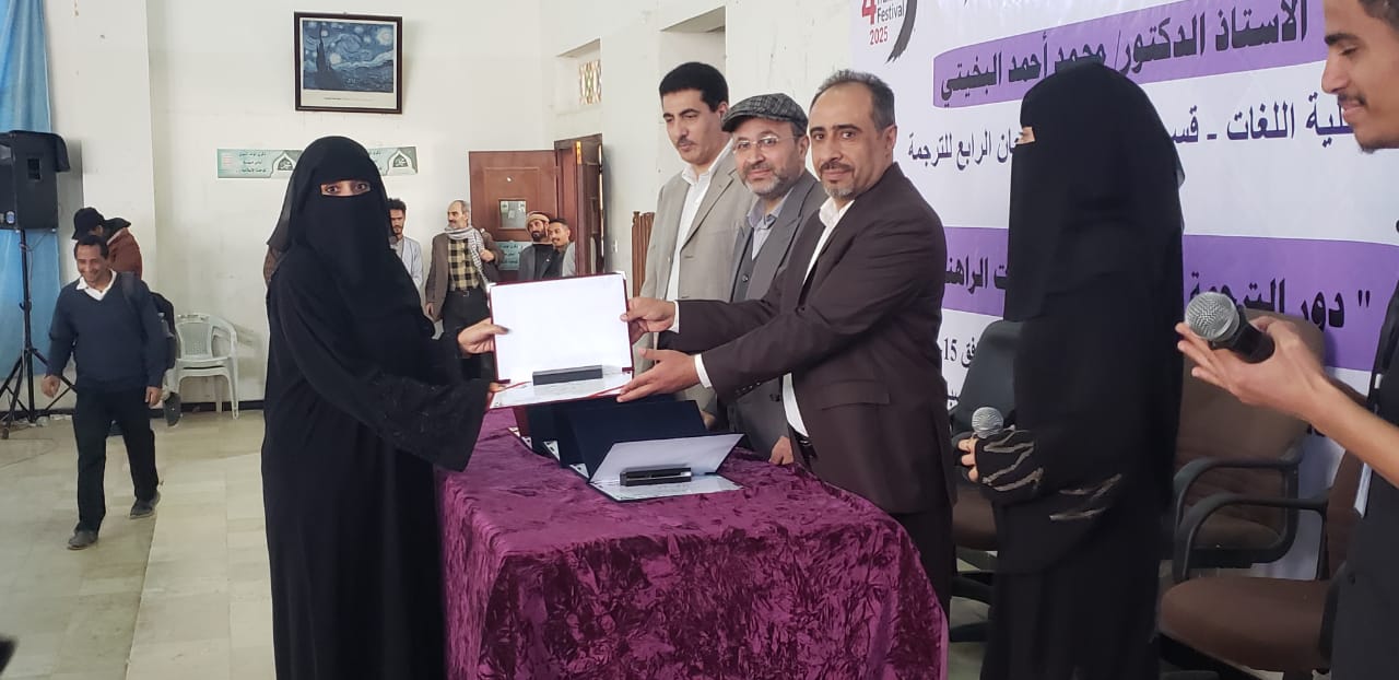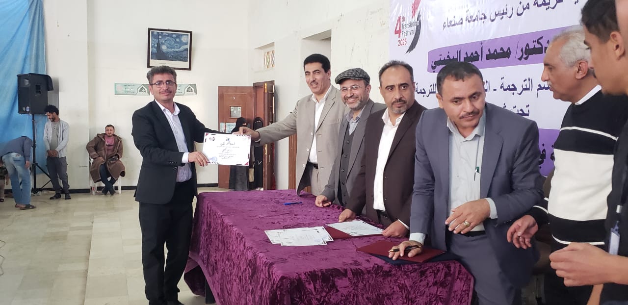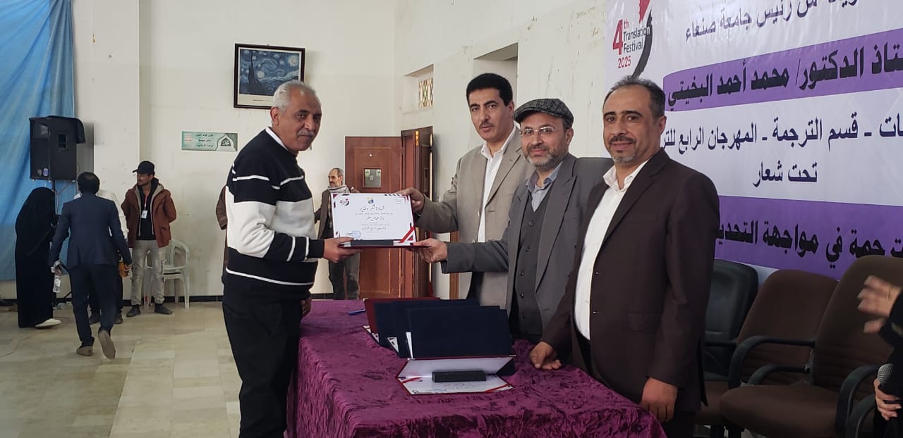 The Faculty of Languages at Sana’a University concluded today the activities of the Fourth Translation Festival, held under the patronage of Prof. Mohammed Ahmed Al-Bukhaiti, Rector of Sana’a University, and organized in cooperation with the University Student Forum (USF) under the theme: “The Role of Translation in Addressing Contemporary Challenges.” The closing ceremony witnessed wide participation from students, faculty members, and those interested in translation and language studies.