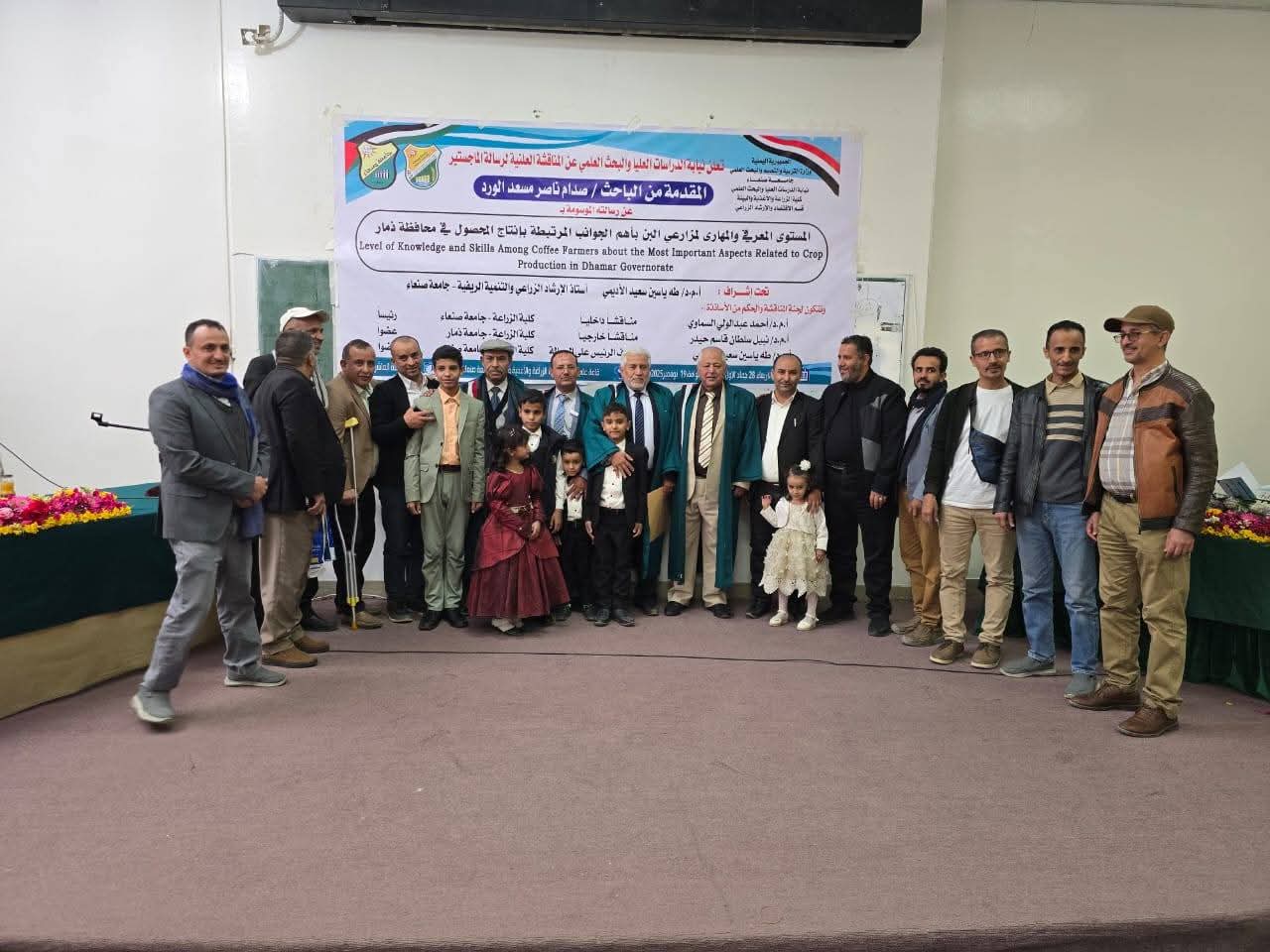 Mr. Saddam Nasser Mosaad Al-Ward was awarded a Master’s Degree in Agricultural Extension and Rural Development for his thesis titled: Level of Knowledge and Skills among Coffee Farmers about the Most Important Aspects Related to Crop Production in Dhamar Governorate, which was submitted to the Department of Agricultural Extension and Rural Development, Faculty of Agriculture – Sana’a University. The MA defense was held on Wednesday, November 19, 2025.