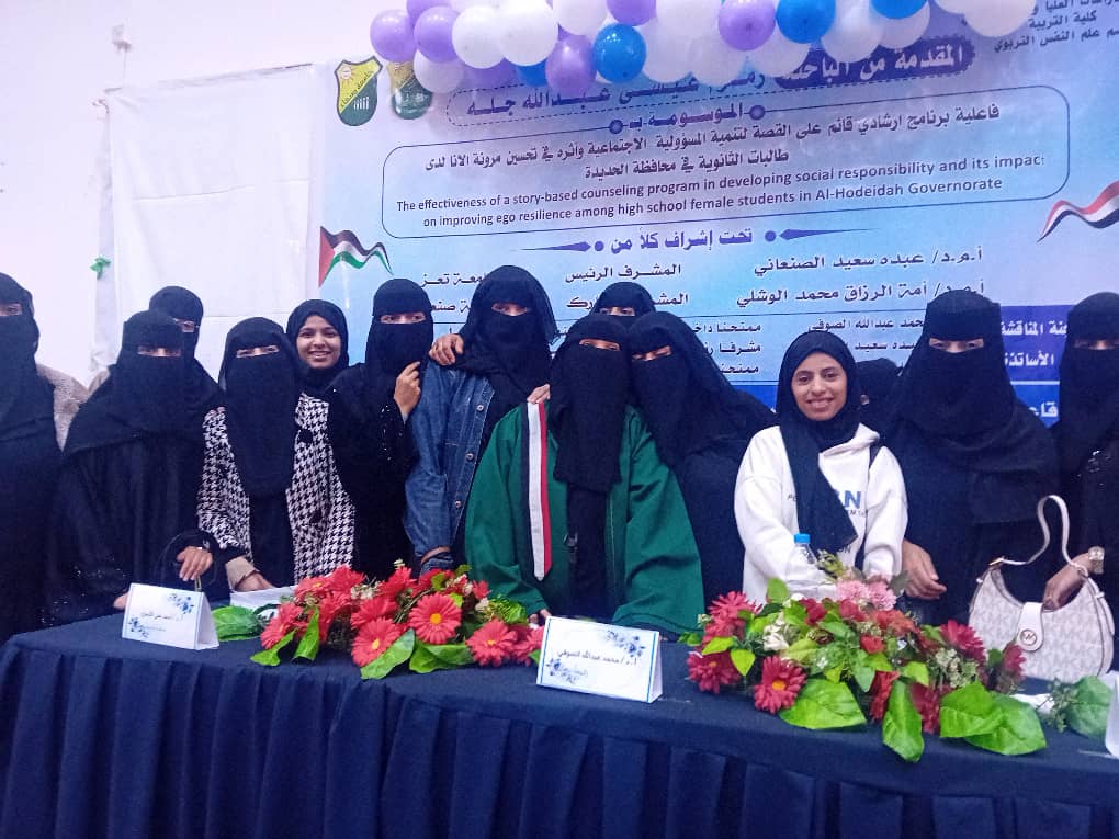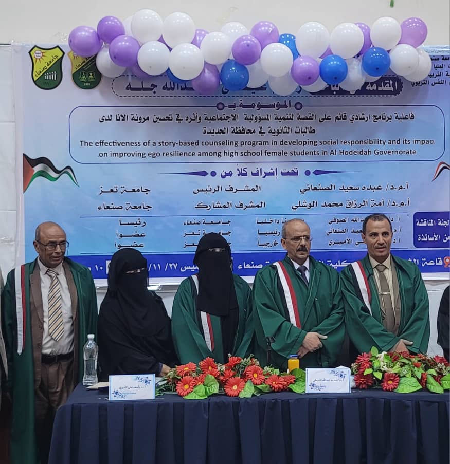 Ms. Zamzam Issa Abdullah Jallah was awarded a PhD degree in Educational Psychology for her dissertation titled: The Effectiveness of a Story-Based Counseling Program in Developing Social Responsibility and Its Impact on Improving Ego Resilience Among High School Female Students in Hodeida Governorate, which was submitted to the Department of Educational Psychology at the Faculty of Education – Sana’a University. The dissertation defense was held on Thursday, November 27, 2025.