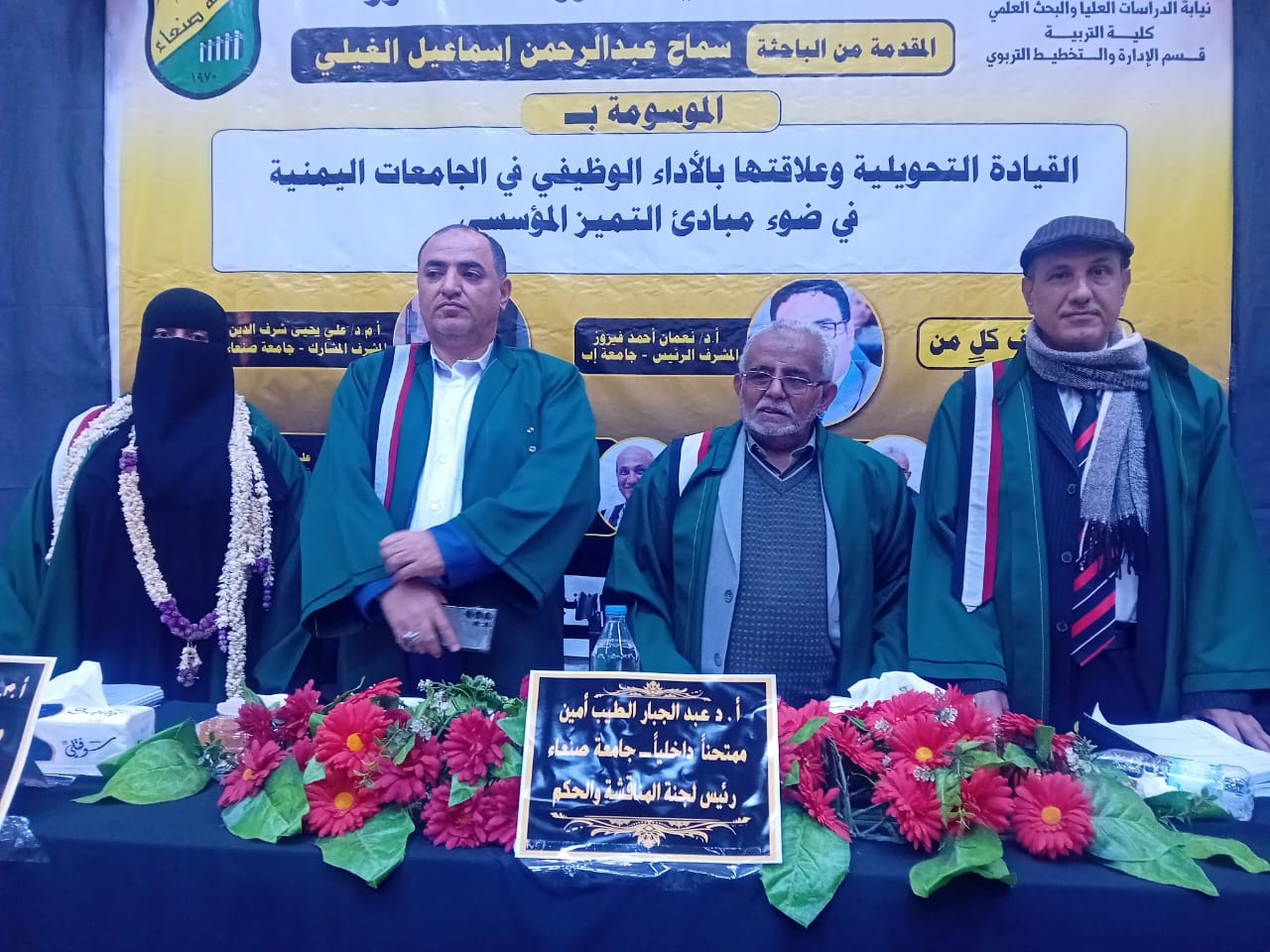 Ms. Samah Abdulrahman Ismail Al-Ghaili was awarded a PhD degree in Educational Administration and Planning for her dissertation titled: Transformational Leadership and Its Relationship to Job Performance in Yemeni Universities in Light of Institutional Excellence Principles, which was submitted to the Department of Educational Administration and Planning, Faculty of Education – Sana’a University. The dissertation defense was held on Monday, December 1, 2025.