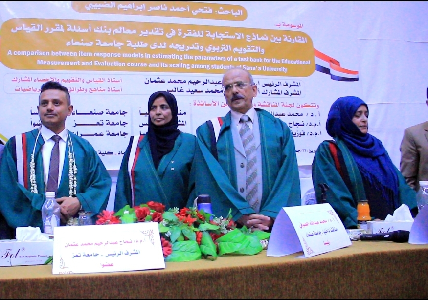 Mr. Fatehi Ahmed Nasser Ibrahim Al-Dhubaibi was awarded a PhD degree in Educational Psychology–Measurement and Evaluation for his dissertation titled: A Comparison between Item Response Models in Estimating the Parameters of a Test Bank for the Educational Measurement and Evaluation Course and Its Scaling among Students at Sana’a University, which was submitted to the Department of Educational Psychology, Faculty of Education – Sana’a University. The dissertation defense was held on Thursday, November 13, 2025.