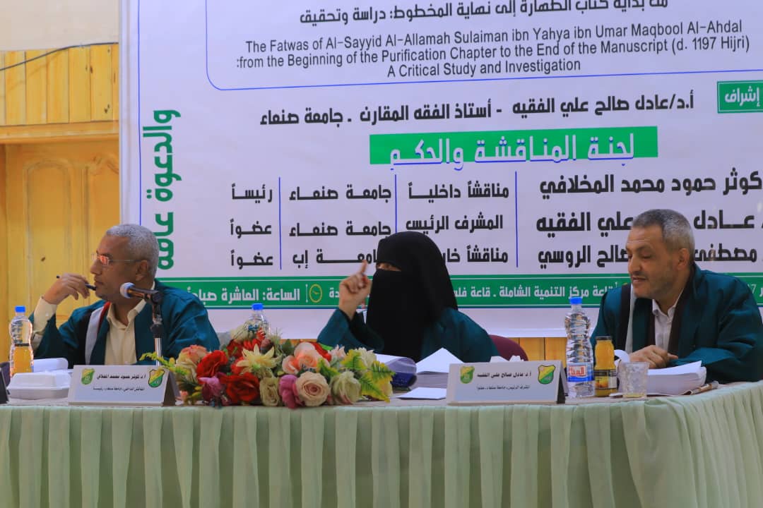 Mr. Mohammed Shaybah Qasem Al-Ahdal was awarded a PhD degree in Islamic Jurisprudence and Its Foundations for his dissertation titled: Fatawa of Sulaiman bin Yahya bin Omar Maqbool Al-Ahdal (d. 1197 AH): From the Beginning of Purification Chapter to the End of the Manuscript, which was submitted to the Department of Islamic Studies, Faculty of Arts and Humanities – Sana’a University. The dissertation defense was held on Wednesday, December 3, 2025.