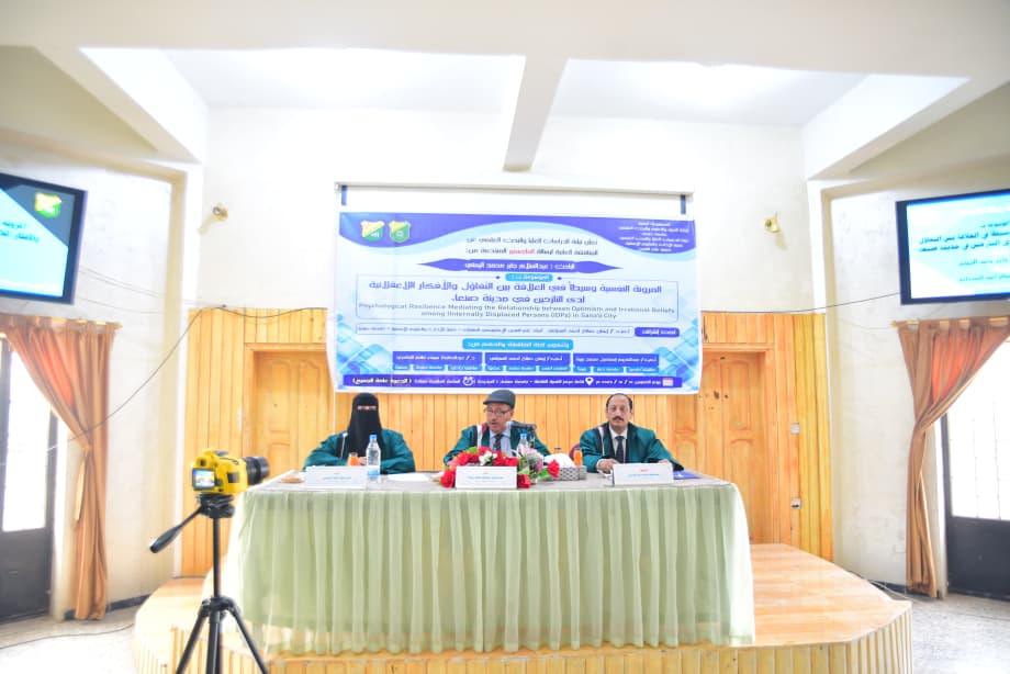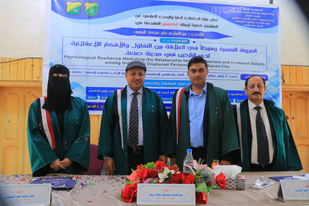 Mr. Mr. Abdulsalam Jaber Mohammed Al-Yemeni was awarded a Master’s Degree in Psychological Counseling and Mental Health with an average of Excellent and a grade of (95) for his thesis titled: Psychological Resilience as a Mediator in the Relationship between Optimism and Irrational Thoughts among Internally Displaced Persons in the City of Sana’a, which was submitted to the Department of Psychology, Faculty of Arts and Humanities – Sana’a University. The MA defense was held on Thursday, December 18, 2025.