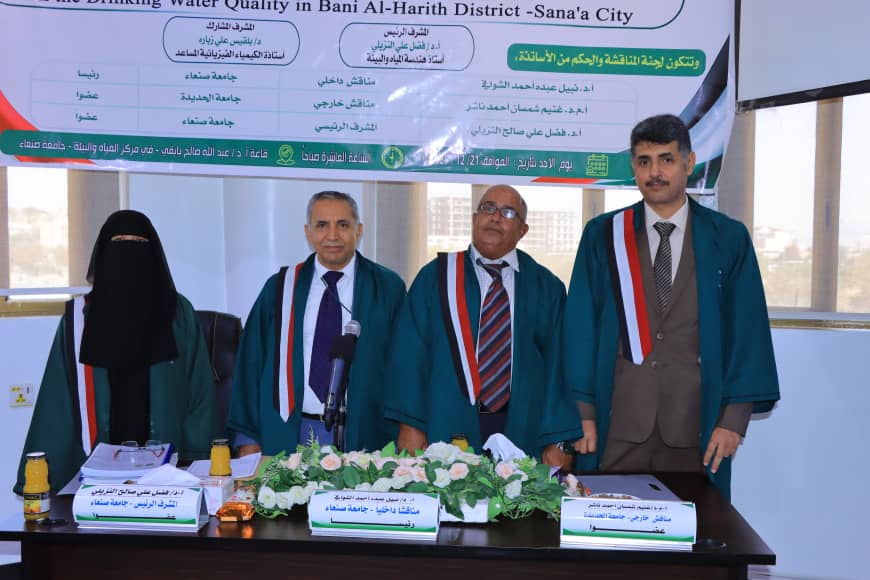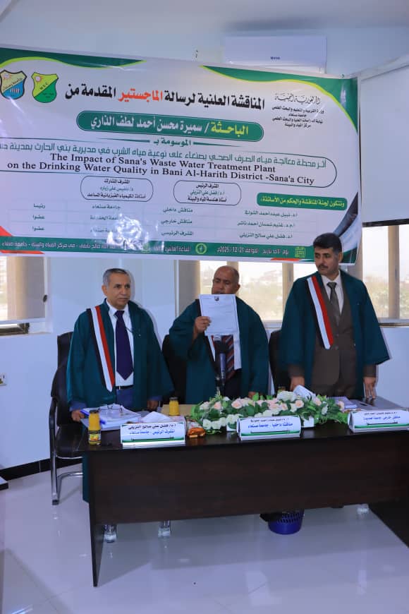 Ms. Samira Mohsen Ahmed Lutf Al-Thari was awarded a Master’s Degree in Integrated Water Resources Management for her thesis titled: The Impact of Sana’s Waste Water Treatment Plant on the Drinking Water Quality in Bani Al-Harith District -Sana’a City, which was submitted to the Water and Environment Center – Sana’a University. The MA defense was held on Sunday, December 21, 2025.