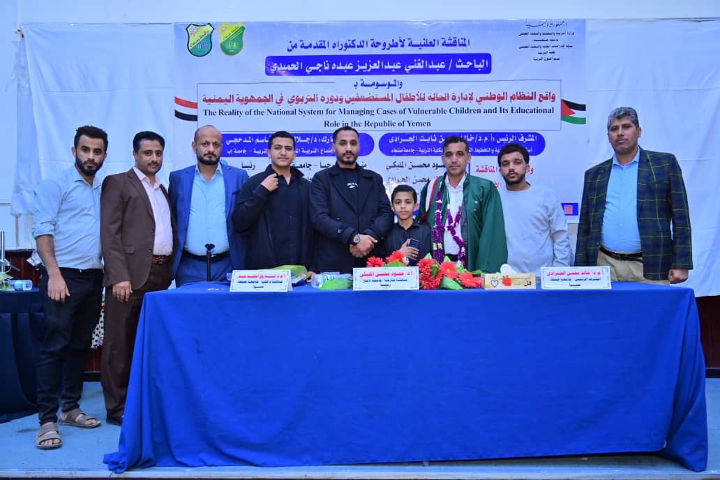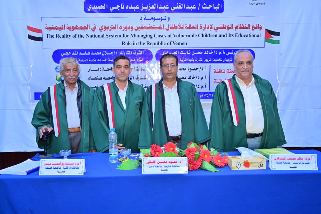 Mr. Abdulghani Abdulaziz Abdo Naji Al-Humaidi was awarded a PhD degree in Education Foundations for his dissertation titled: The Reality of the National System for Managing Cases of Vulnerable Children and Its Educational Role in the Republic of Yemen, which was submitted to the Department of Education Foundations, Faculty of Education – Sana’a University. The dissertation defense was held on Tuesday, December 23, 2025.