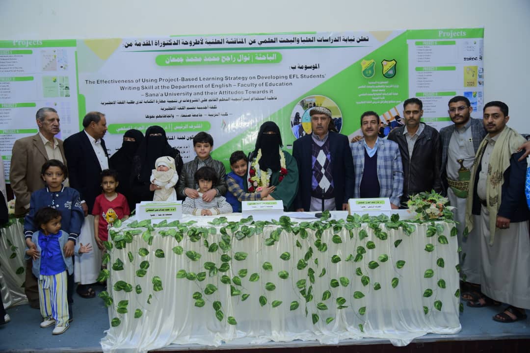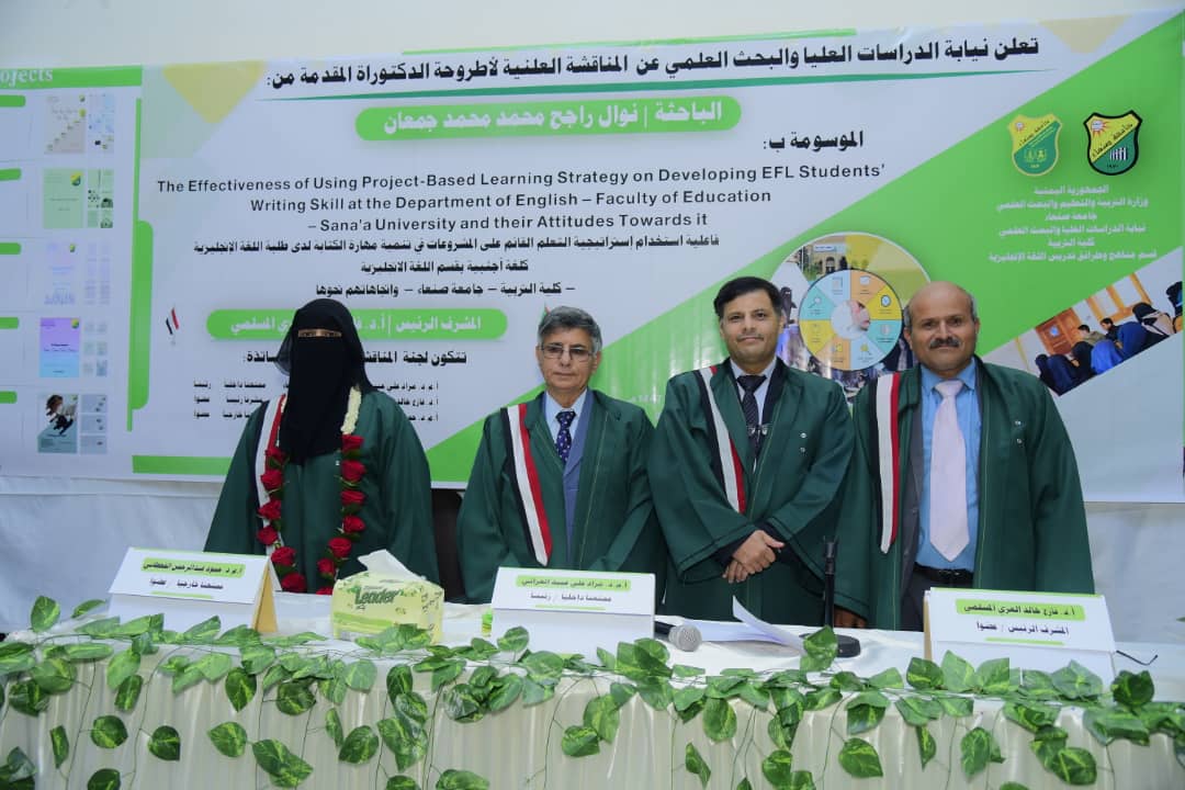 Ms. Nawal Rajeh Mohammed Mohammed Mohammed Jumaan was awarded a PhD degree in English Language Curriculum and Teaching Methods for her dissertation titled: The Effectiveness of Using Project-Based Learning Strategy in Developing Writing Skills among EFL Students at the Department of English, Faculty of Education, Sana’a University, and Their Attitudes toward It, which was submitted to the Department of English Language Curriculum and Teaching Methods, Faculty of Education – Sana’a University. The dissertation defense was held on Thursday, January 1, 2026.