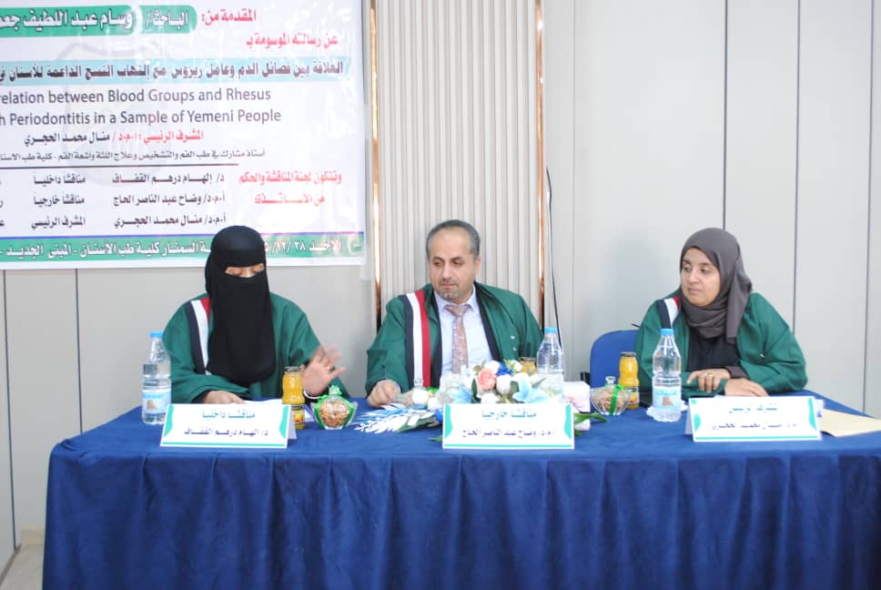 Mr. Wissam Abdulatif Jamoom was awarded a Master’s Degree in Oral Medicine for his thesis titled: The Correlation between Blood Groups and Rhesus Factor with Periodontitis in a Sample of Yemeni People, which was submitted to the Department of Oral Medicine, Periodontics, Diagnostics and Oral Radiology, Faculty of Dentistry – Sana’a University. The MA defense was held on Sunday, December 28, 2025.