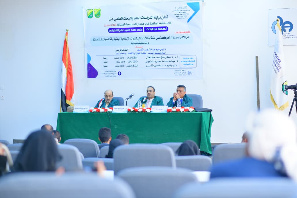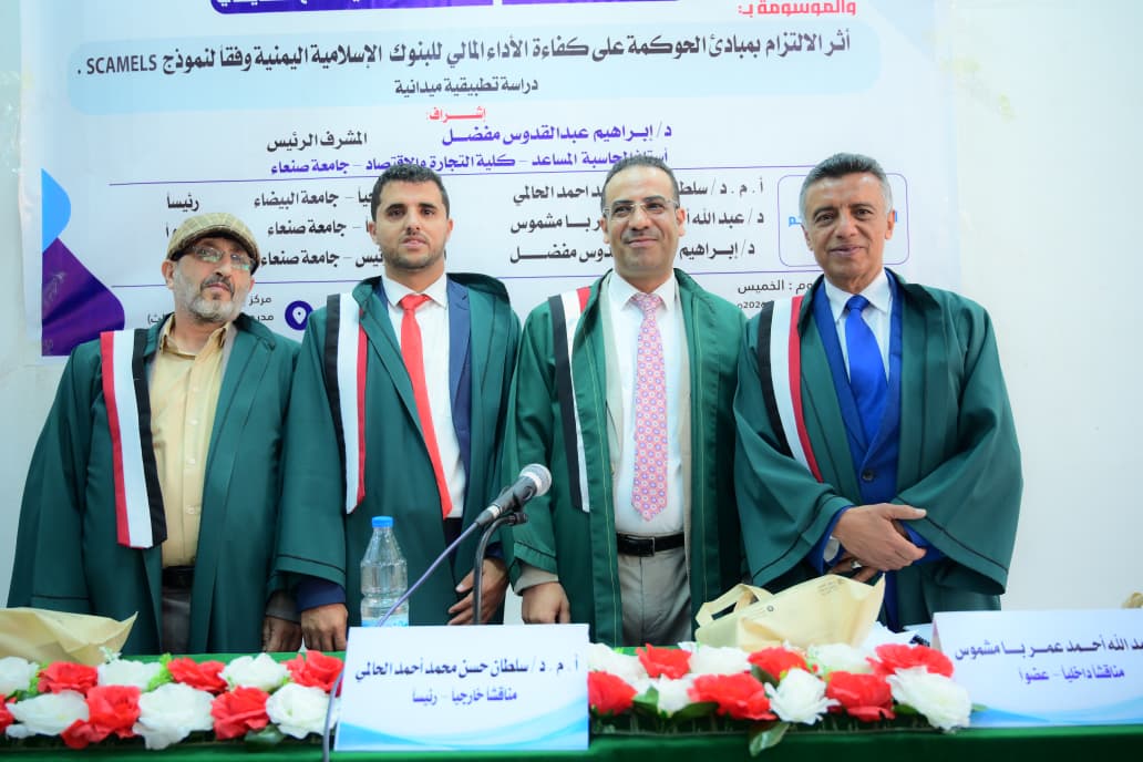 Mr. Ali Ahmed Ali Saleh Al-Ghudhaifi was awarded a Master’s Degree in Accounting for his thesis titled: The Impact of Compliance with Governance Principles on the Efficiency of Financial Performance of Yemeni Islamic Banks According to the SCAMELS Model: An Applied Field Study, which was submitted to the Faculty of Commerce and Economics – Sana’a University. The MA defense was held on Thursday, January 8, 2026.
