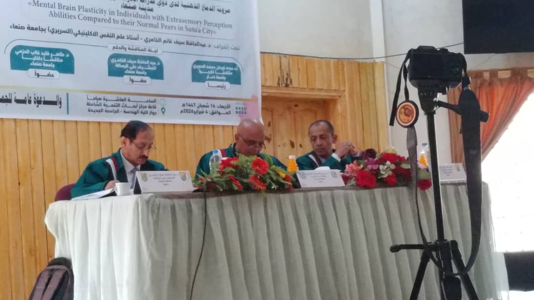 Ms. Samah Rashad Abdullah Al-Akhali was awarded a Master’s Degree in Neuropsychology with an average of excellent (first-class honors) and a grade of (95) for her thesis titled: Mental Brain Plasticity among Individuals with Extra Sensory Perception Abilities Compared to Their Normal Peers in Sana’a City, which was submitted to the Department of Psychology, Faculty of Arts and Humanities – Sana’a University. The MA defense was held on Wednesday, February 4, 2026.
