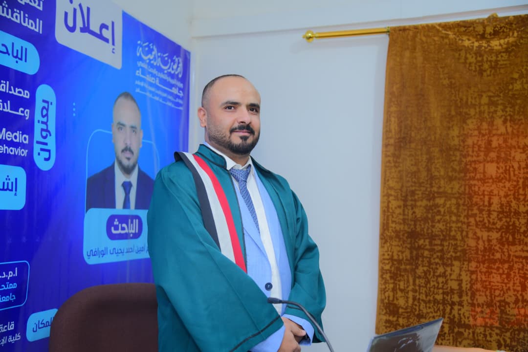 Mr. Dirham Ameen Ahmed Al-Wurafi was awarded a PhD degree in Public Relations and Advertising for his dissertation titled: The Credibility of Celebrity Advertising on Social Media and Its Relationship to Purchasing Behavior of Yemeni Consumer, which was submitted to the Faculty of Mass Communication – Sana’a University. The dissertation defense was held on Wednesday, February 11, 2026.