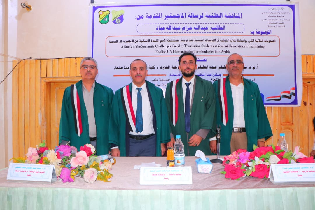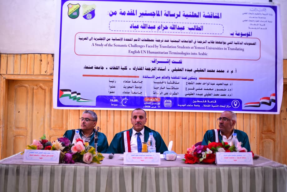 Mr. Abdullah Hezam Abdullah Ubad was awarded a Master’s Degree in Translation Studies with an average of excellent and a grade of (95) for his thesis titled: A Study of the Semantic Challenges Faced by Translation Students at Yemeni Universities in Translating English UN Humanitarian Terminologies into Arabic, which was submitted to the Department of Translation, Faculty of Languages – Sana’a University. The MA defense was held on Wednesday, Sha’ban 23, 1447 Hijri, corresponding to February 11, 2026.