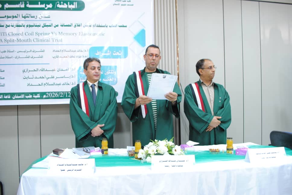 Ms. Marsala Qasem Hassan Hajar was awarded a Master’s Degree in Orthodontics for her thesis titled: Canine Retraction Using NITI Closed Coil Spring Vs. Memory Rastomerie Chain: A Split-Mouth Clinical Trial, which was submitted to the Department of Orthodontics, Faculty of Dentistry – Sana’a University. The MA defense was held on Thursday, February 12, 2026.