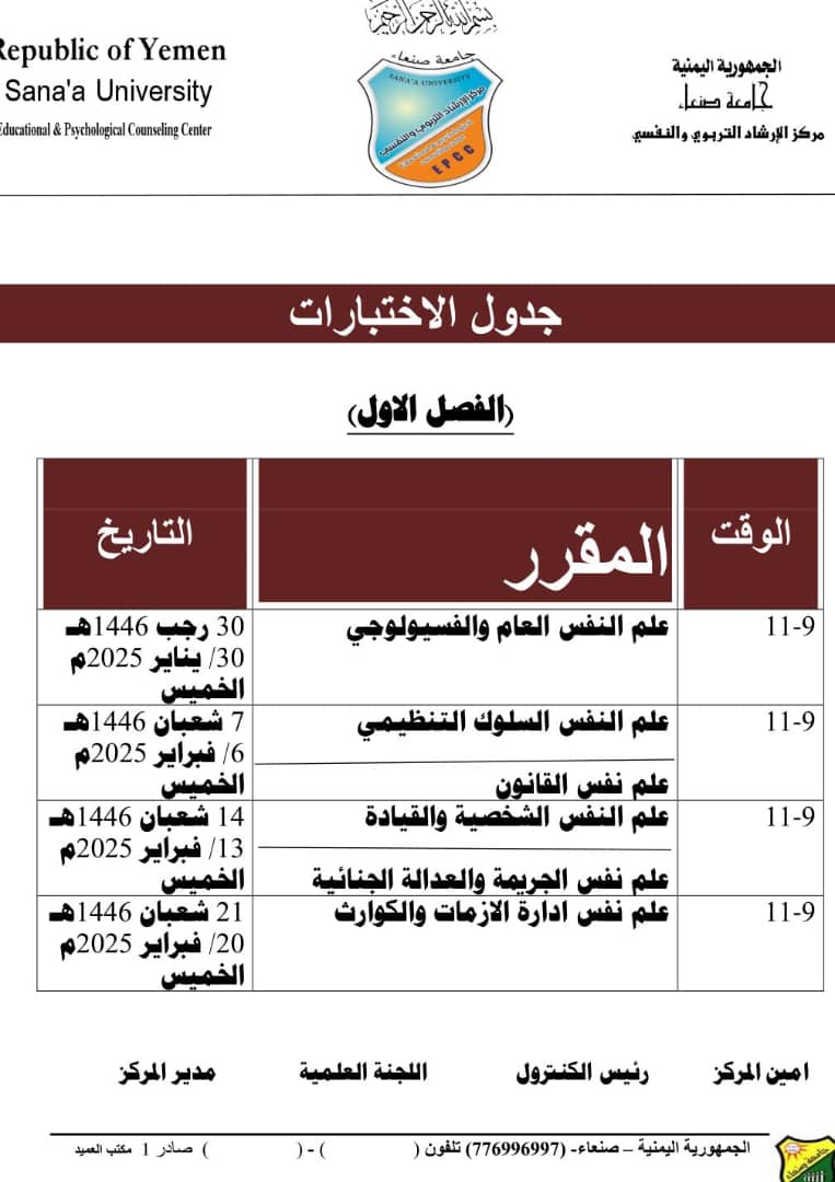 أعلنت إدارة مركز الإرشاد التربوي والنفسي بجامعة صنعاء عن جدول اختبارات الفصل الأول لطلاب الدفعة الثانية في تخصصي علم النفس التنظيمي (الإداري) وعلم نفس الجريمة والعدالة الجنائية. وتم تحديد مواعيد الاختبارات لتسهيل سير العملية التعليمية، حيث يهدف المركز إلى توفير …