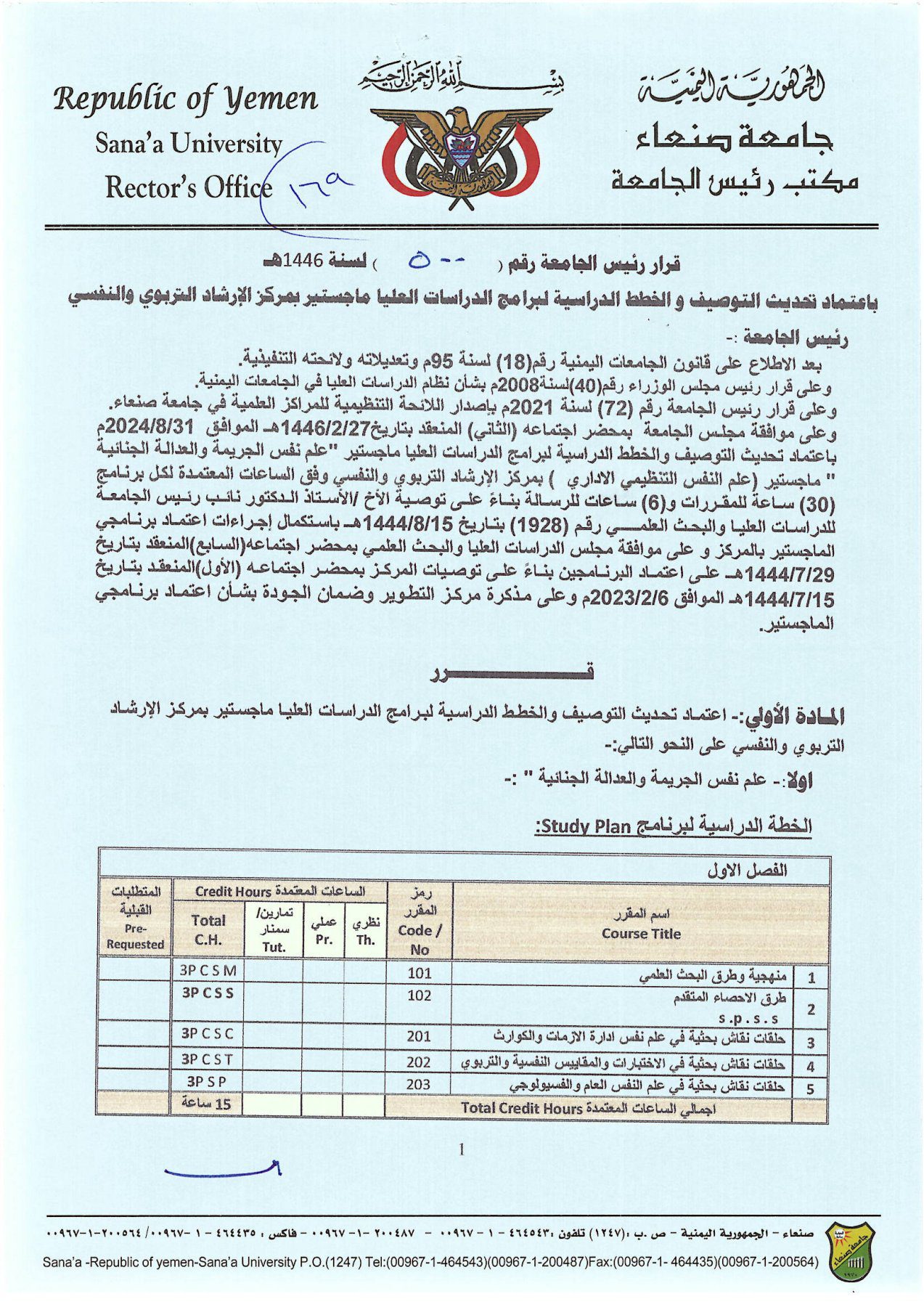 Decision No. (500) of 1446 AH was issued by the President of Sana’a University approving the updated description and study plans for the two postgraduate programs (Master’s) in “Criminal Psychology and Criminal Justice” and “Administrative Organizational Psychology” at the Educational …
